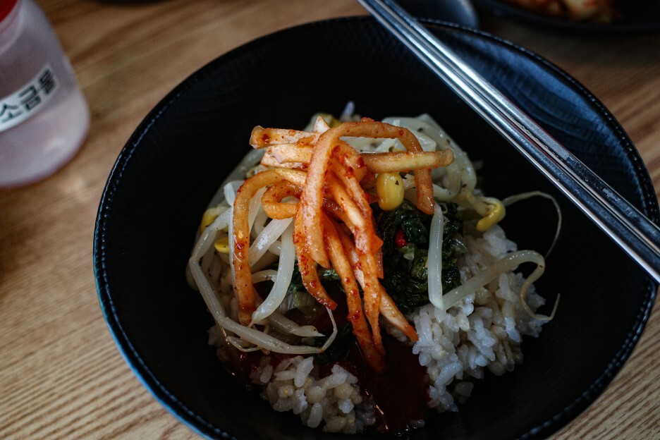 테이블에 있는 고추장, 참기름, 각종 조미료와 반찬으로 나온 나물을 넣고 비벼 먹으면 된다.