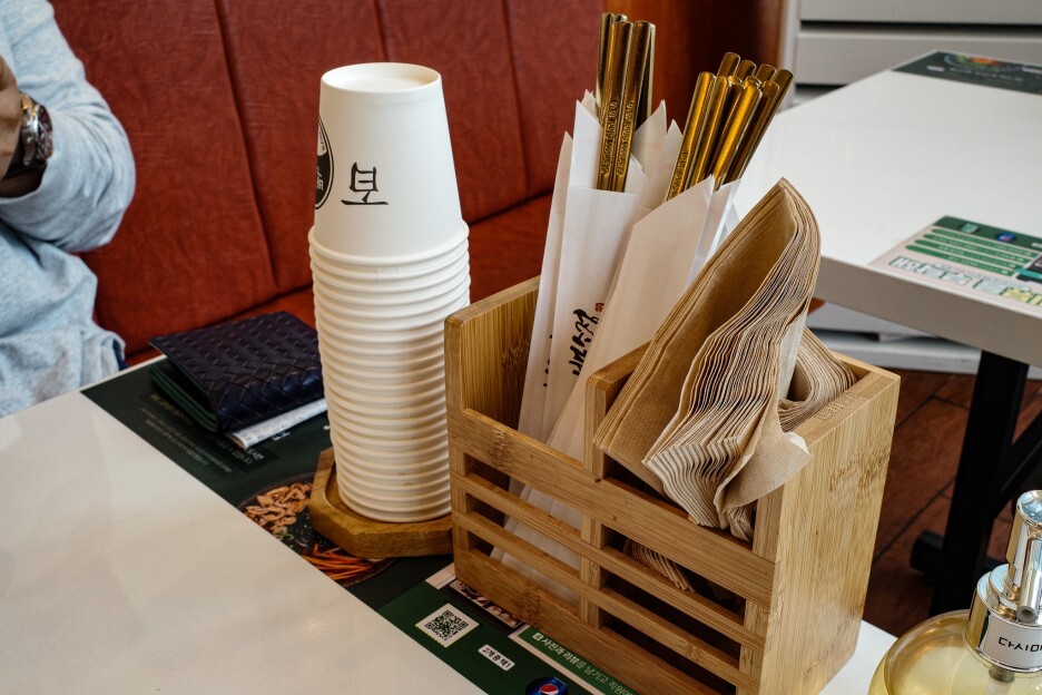 테이블 한쪽으로 종이컵, 수저, 냅킨, 다시마 소스가 있다