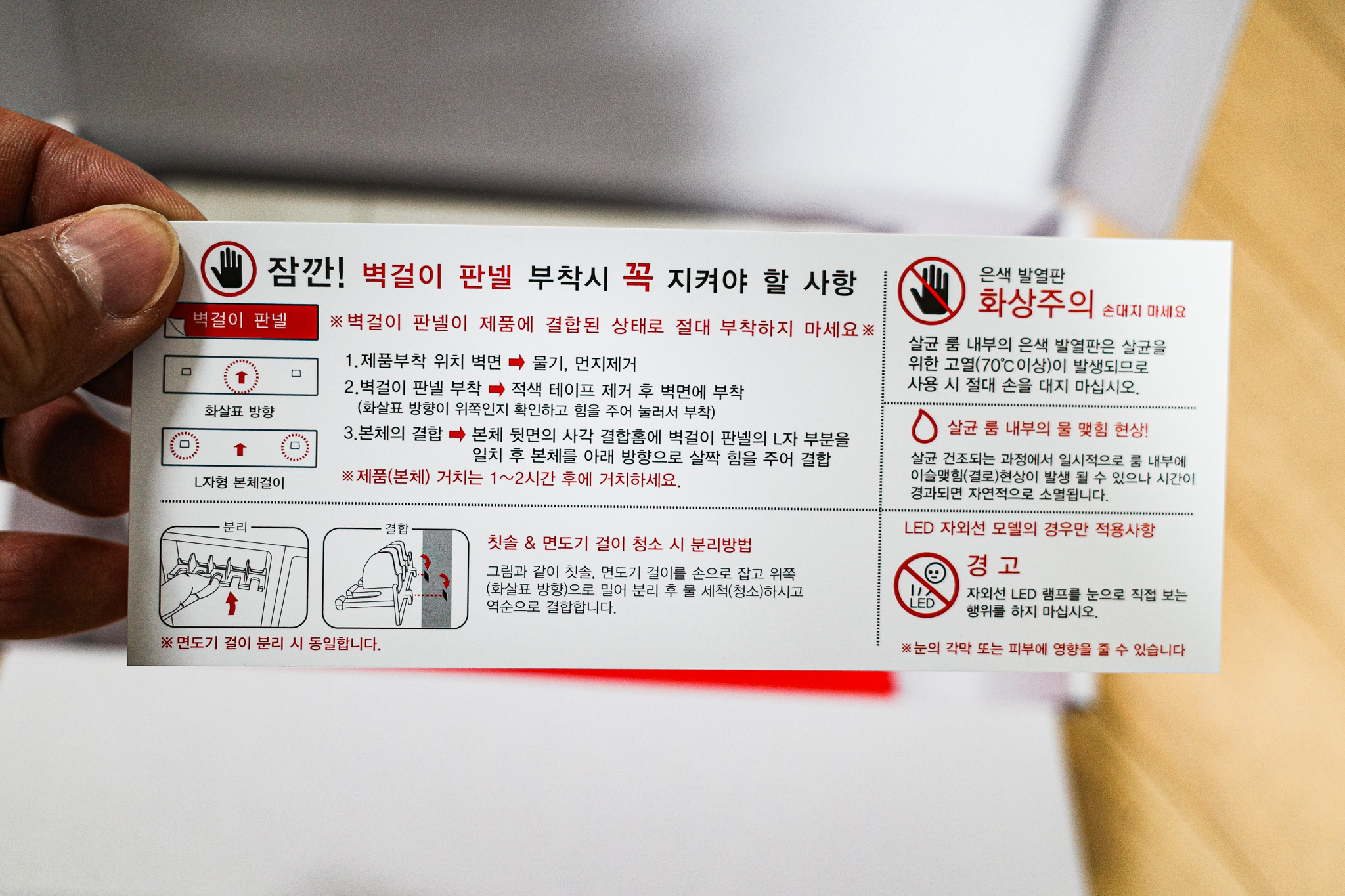 살균 건조기의 히터에 날 부분이 향하게 하려면 약간 비스듬하게 거치가 됩니다.