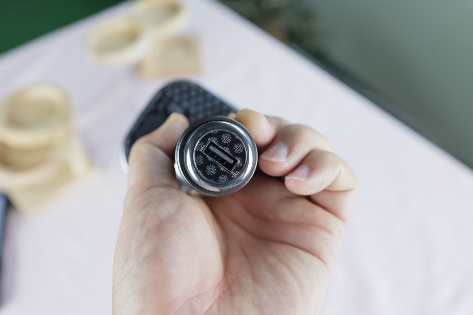 손잡이 아래쪽에 위치한 USB 단자 여기에 MP3 등을 꽂아 바로 재생이 가능하다.