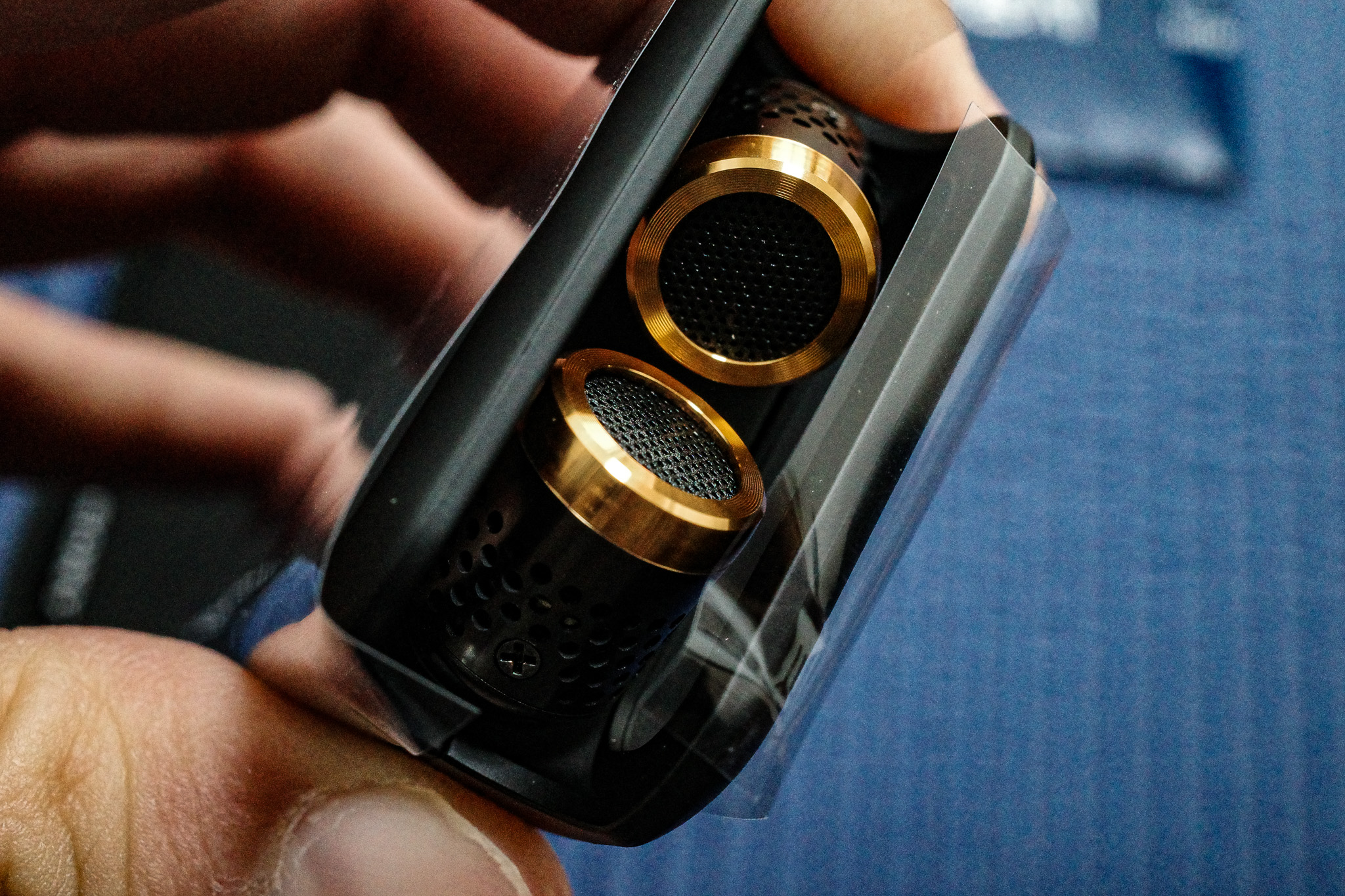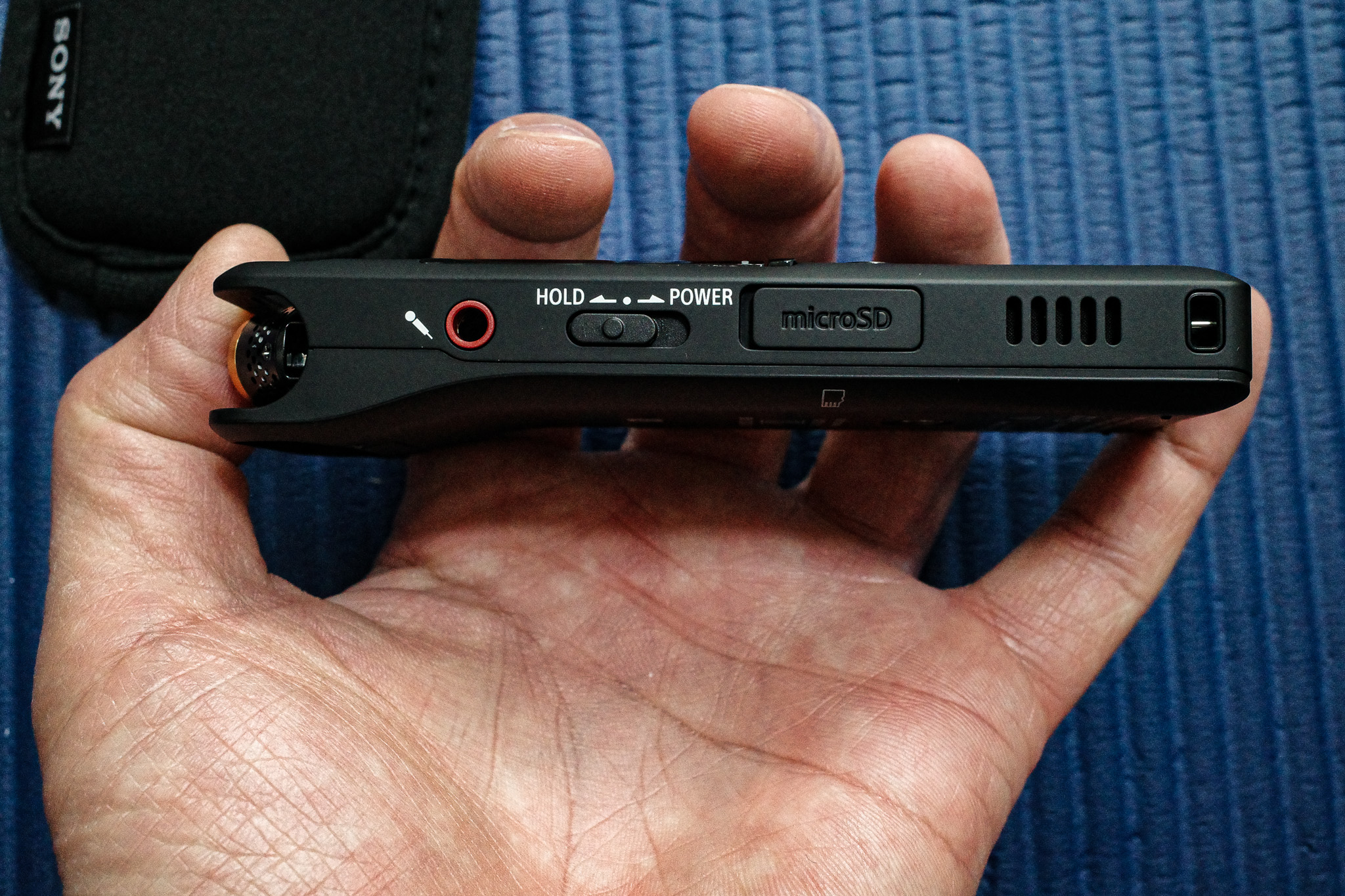 상단에는 마이크로폰 연결 잭이 존재하고 파워 버튼과 외장 메모리 슬롯이 존재한다.