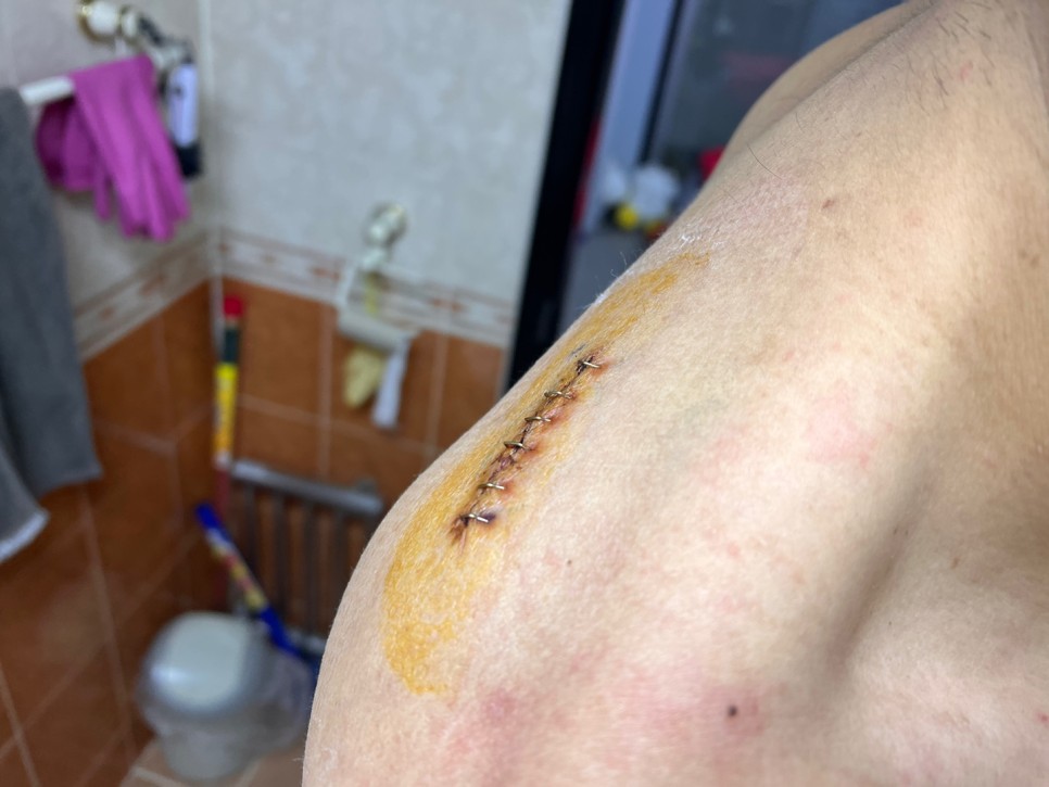 이것이 수술의 결과 약 8cm 절개가 되었고 스테이플러로 박아 놈
