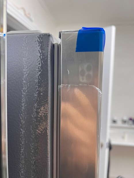 상단 도어 문짝 윗부분에 검은색의 이물질이 묻어 있는 띠를 발견