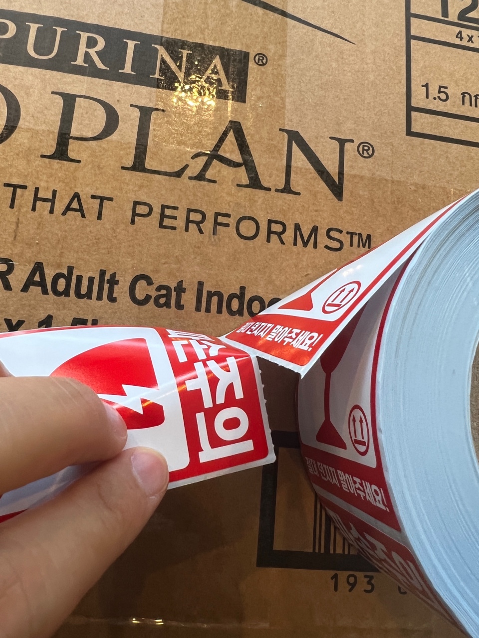 일반 박스 포장 테이프를 사용하려고 하다가 저희가 주로 취급하는 제품이 사료나 영양제이다 보니 배송 중에 터질 가능성이 있어서 좀 더 안전을 기하자는 의미에서 취급 주의 스티커 등 안전배송에 도움이 될 만한 제품을 준비하였습니다.