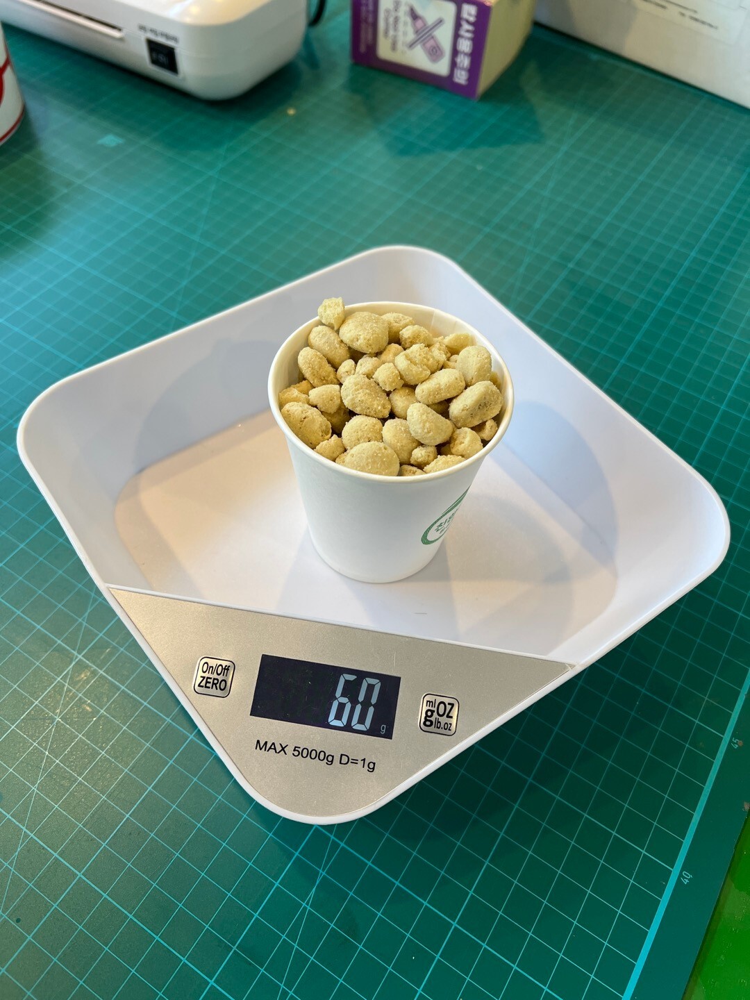 일반적인 종이컵을 가득 채우면 딱 60g 정도가 나옵니다.