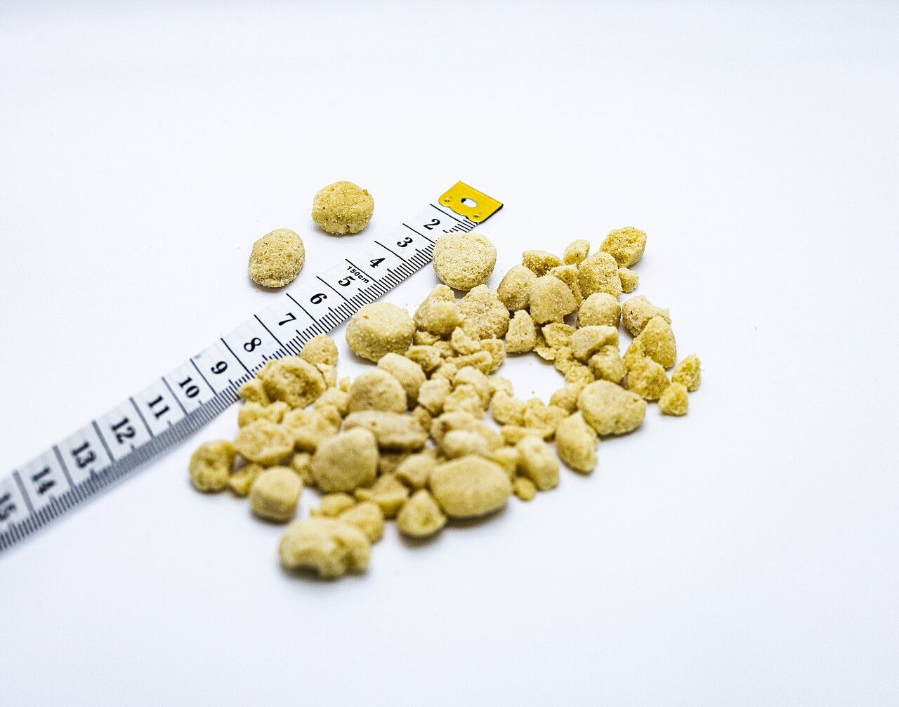 콩으로 만든 사료라 일반적인 동물성 사료와 비교했을 때 입자의 색상이 굉장히 밝은 편입니다.