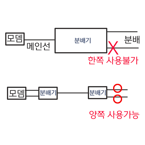 모뎀에서 두 가닥을 연결해야 한다.. 그리고 저 빨간 랜선이 한 줄로 쭉 가다가..