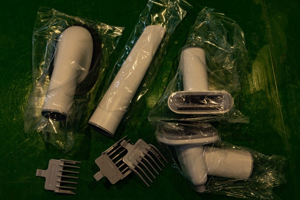 여러 가지 종류의 브러시가 들어 있지만 전 오직 한 가지만 사용하고 있고요. 사용 시간이 길지 않아서 아주 세밀한 후기를 알려드릴 수는 없지만 진공 흡입 미용기의 가장 중요한 포인트인 ① 미용 시 털 날림 ② 절삭력 ③ 소음에 포인트를 잡고 알려드리겠습니다.