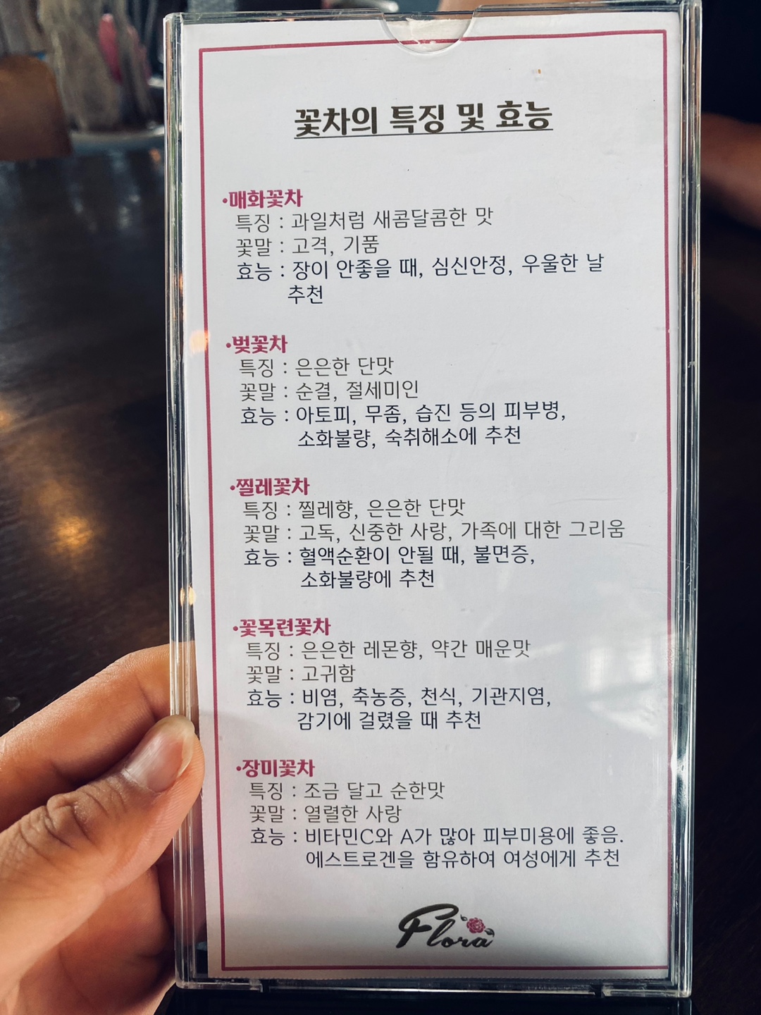테이블에는 각 꽃 차의 효능이 적힌 안내표가 있다.