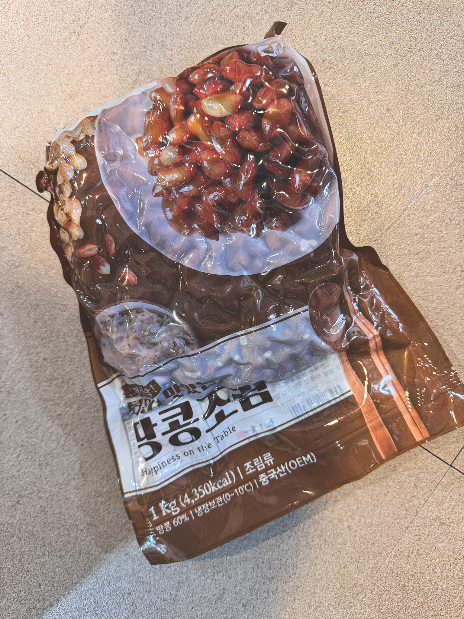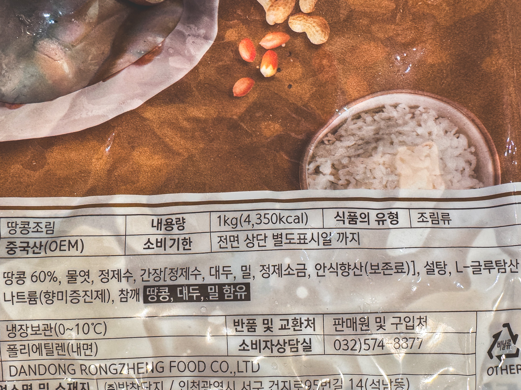 이 제품은 중국에서 OEM방식으로 제조된 후 국내로 수입된 반찬입니다. 땅콩은 60% 이상 함유되어 있으며, 물엿, 간장, 설탕, 참기름 등 기본적인 양념으로 조려져 있어 익숙하고 전통적인 맛을 살렸습니다.
