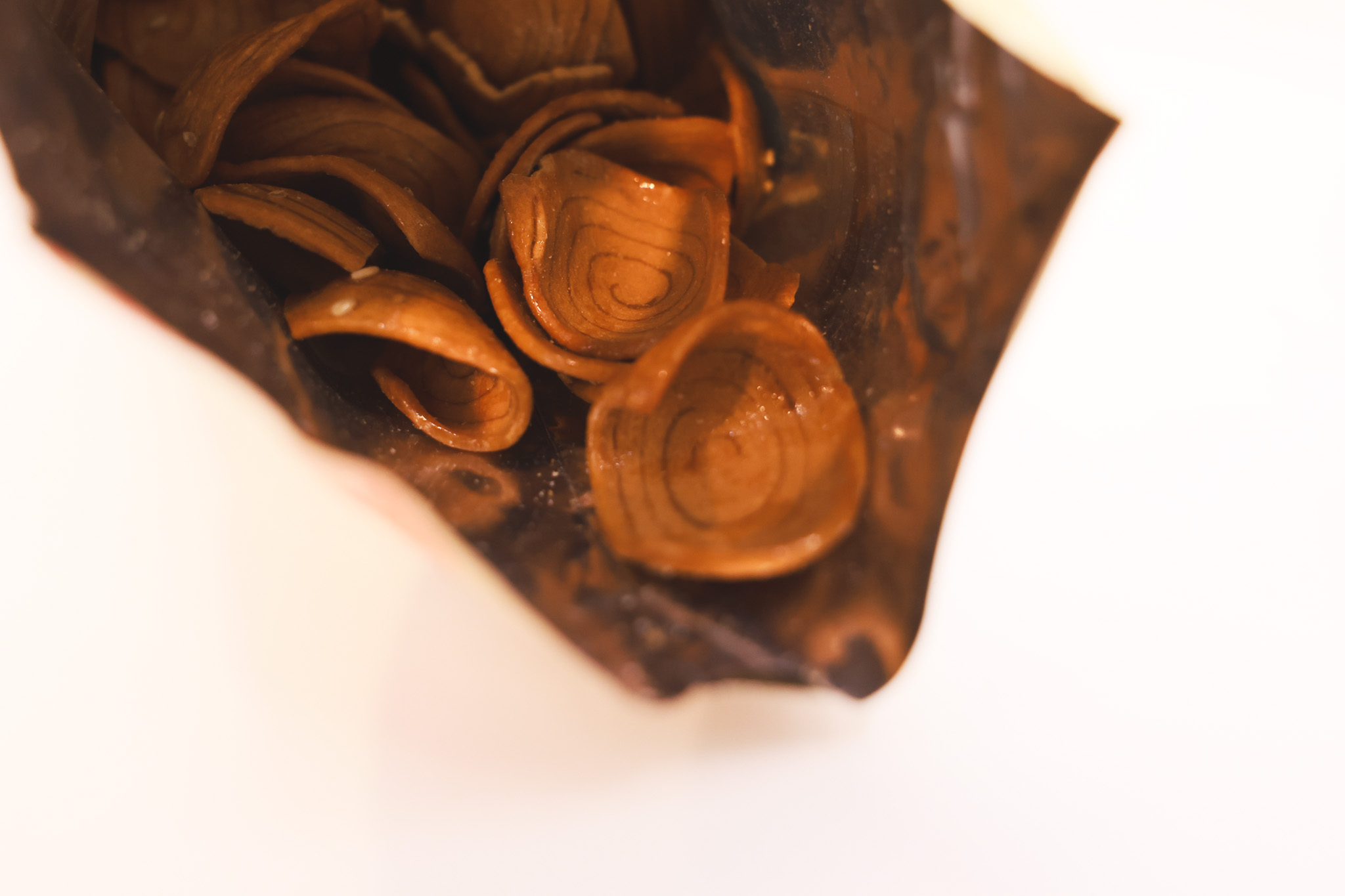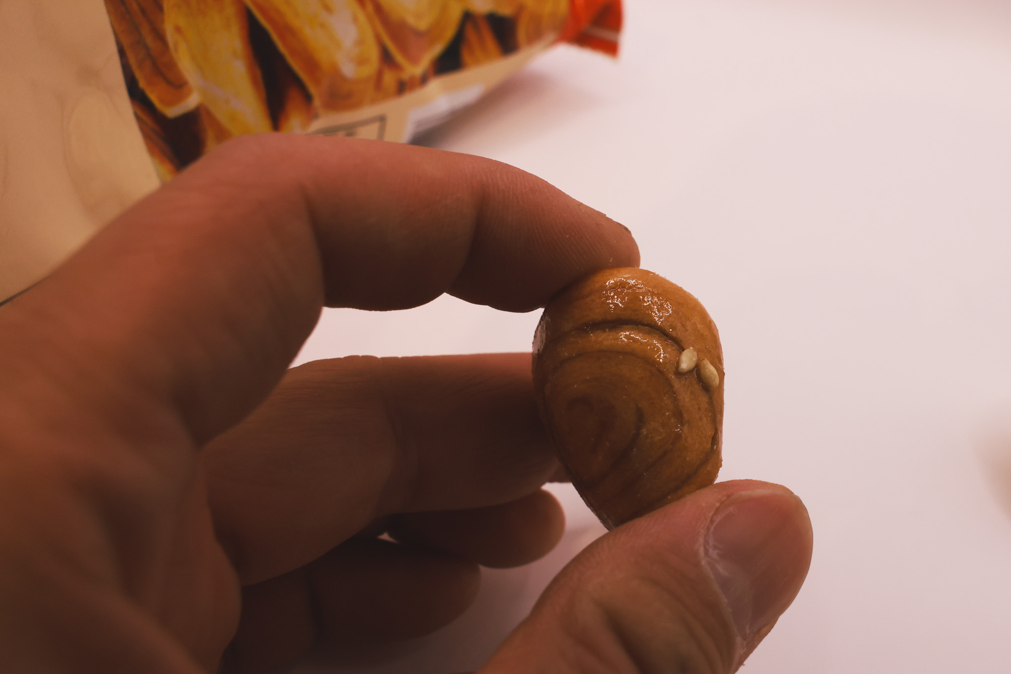 고구마형 과자의 표면엔 은은한 광택이 돌아요! 마치 설탕 시럽을 살짝 입힌 듯 반짝이는 그 윤기에서 먹기도 전에 달콤함이 느껴집니다. 소용돌이 모양으로 촘촘히 잡힌 결은 겉은 바삭하고 속은 부드럽게 녹아들 것이다라는 식감을 예고하고 있는 듯합니다.
