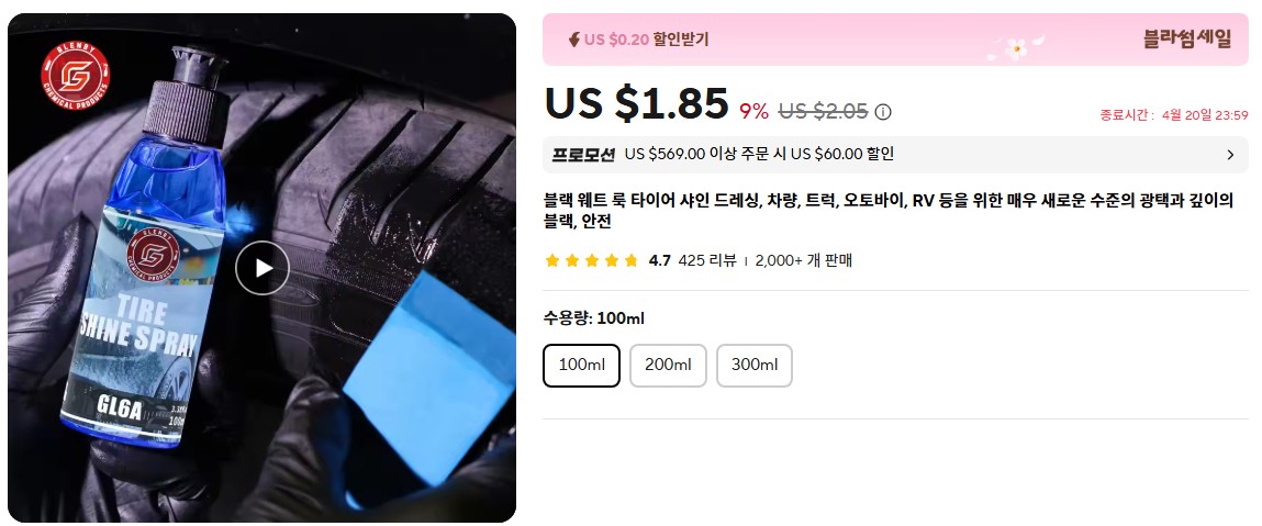 이번에 알리에서 여러 가지 물품을 사는 와중에 저렴하면서 평가도 좋은 타이어 광택제 스츠레이 타입 제품이 있어서 한 번 구매해 보았다.
