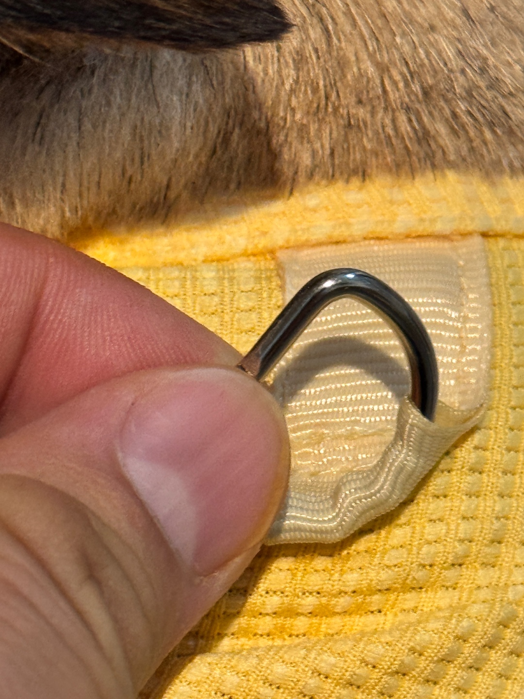 또 하나 좋은 점이 고리가 있어서 하네스를 굳이 안 해도 된다는 점이다. 옷이 신축성이 있긴 하나 짱짱한 편이라 그리 늘어나지 않는다. 다만 이런 옷에 부착되어 있는 고리의 경우 아이가 얌전한 타입이거나 옷이 하네스 정도의 짱짱함을 가지고 있어야 무리 없는 사용이 가능하다.. 우리 멍뭉이는 엄청 얌전한 아이라 이 옷에 달려 있는 고리로도 충분했다.