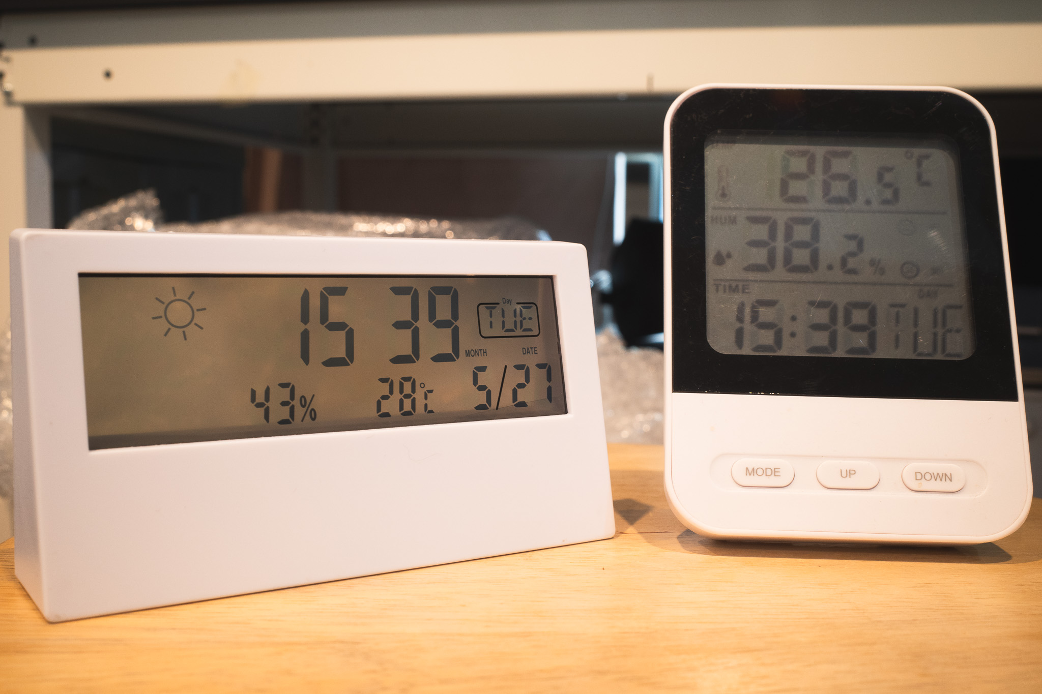 둘 다 온도, 습도, 시간, 날짜 다 잘 보여주고, 알람 기능도 있고, 무소음이라 밤에도 거슬림이 없다.