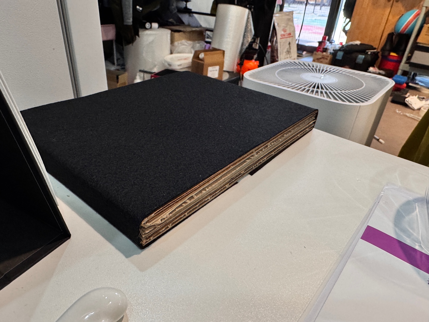 한쪽은 골판지 박스로 만들었고 한쪽은 자동차 필터로 만들었다. 겉은 검은색 부직포로 마감.. ㅋ 아무래도 스피커 울림이 있다보니 진동 차단 차원에서 ㅋㅋ 이 받침이 없었다면 저음이 책상에 그대로 전달되어 거슬렸을지도 모르겠다.