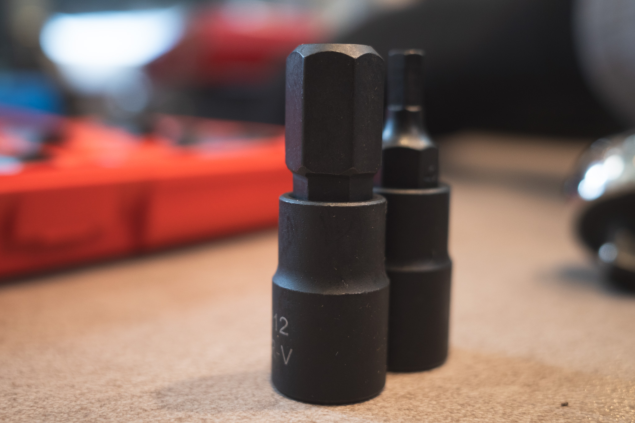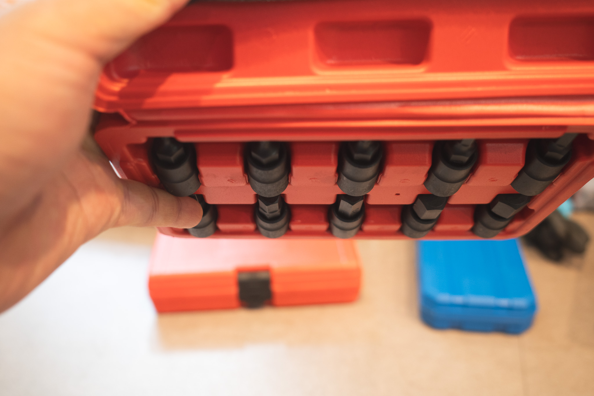 소켓 표면 마감이 아주 정교하진 않다는 느낌 (스크래치 방지 코팅은 없음) 사이즈 표기가 양각인데 작게 표시되어 있어 작업 중엔 잘 안 보임 내부 고무 고정은 없지만, 대신 소켓 길이로 고정이 되긴 함