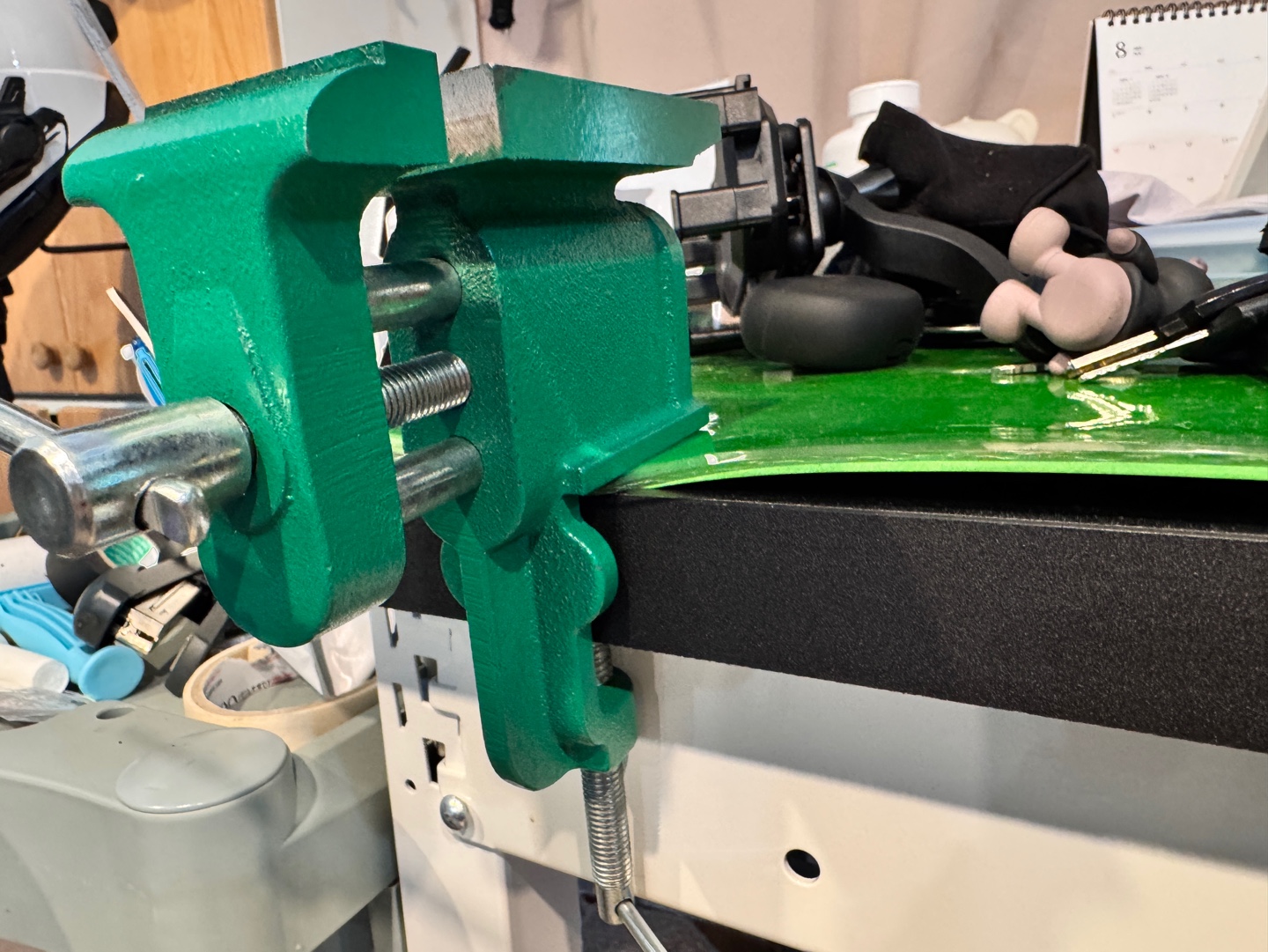 제가 설치할 때는 두께 4cm 정도의 나무 책상에 고정했는데, 흔들림 없이 단단히 고정되었습니다. 금속 책상이나 공방용 작업대에도 문제없이 사용할 수 있을 것 같아요. 다만, 고정할 면이 너무 얇거나 약한 재질이라면 클램프 자국이 남을 수 있으니, 필요하다면 얇은 고무판이나 나무 조각을 사이에 끼워주는 게 좋습니다.