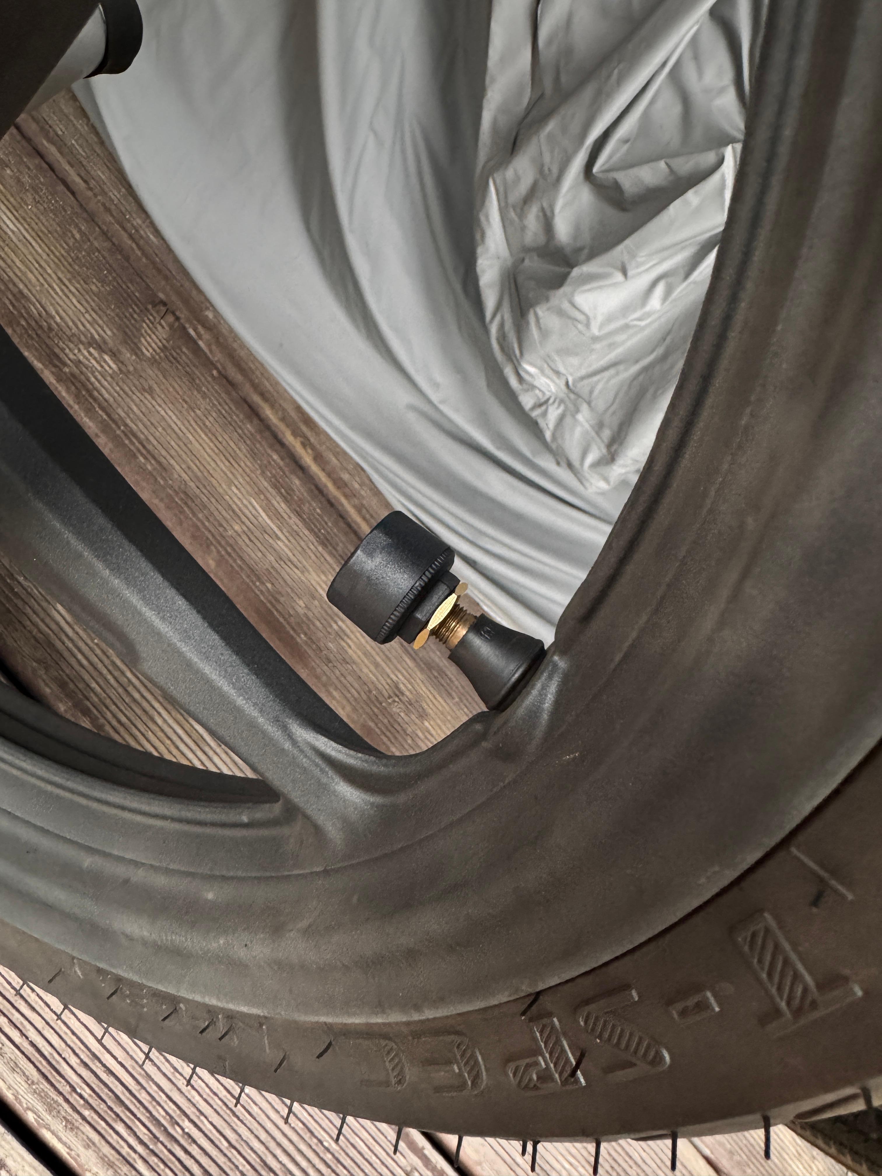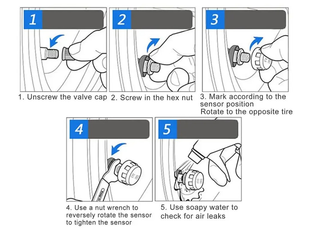 제품에 포함된 센서를 앞·뒤 타이어 밸브에 각각 돌려 끼웁니다.