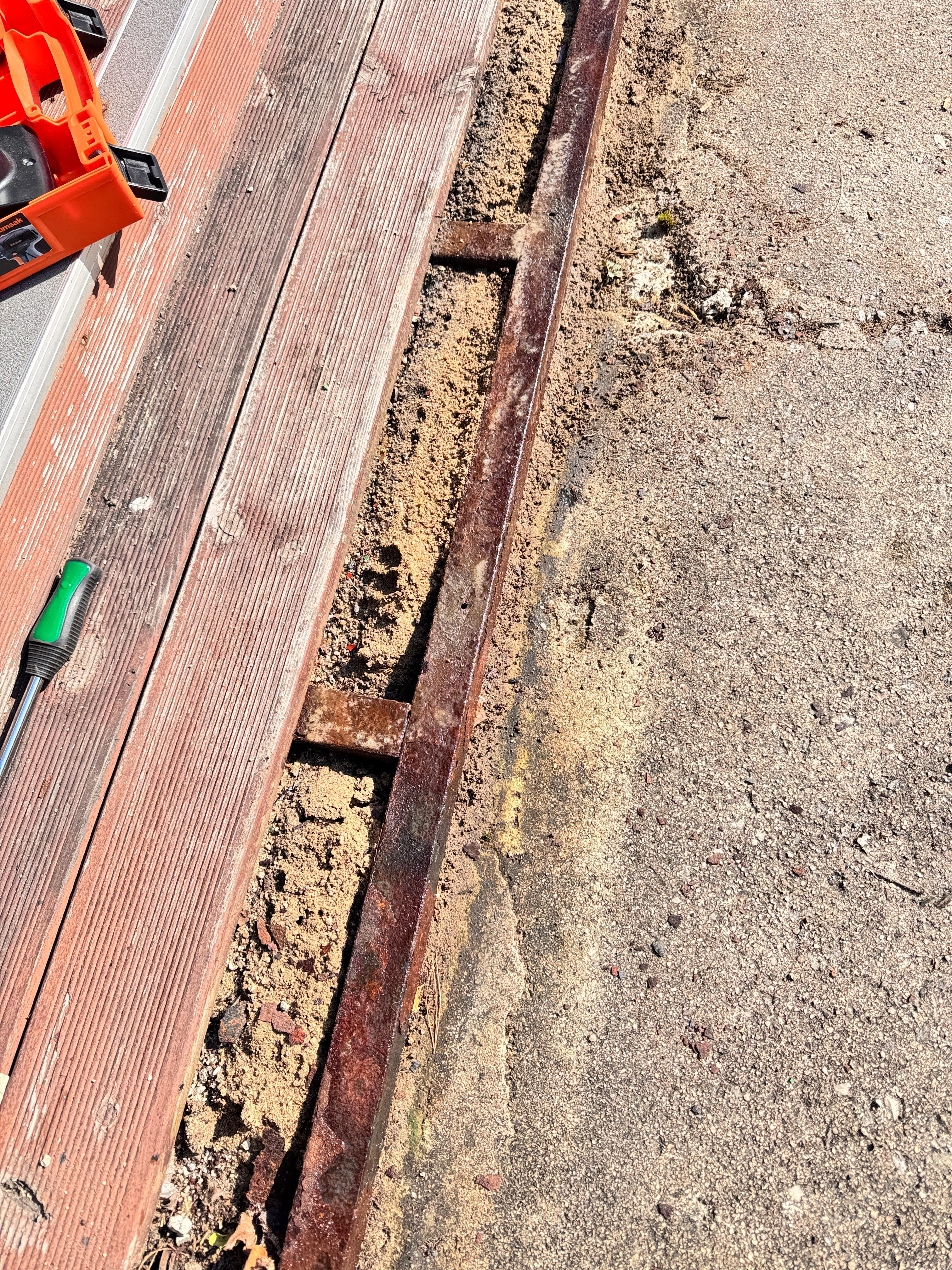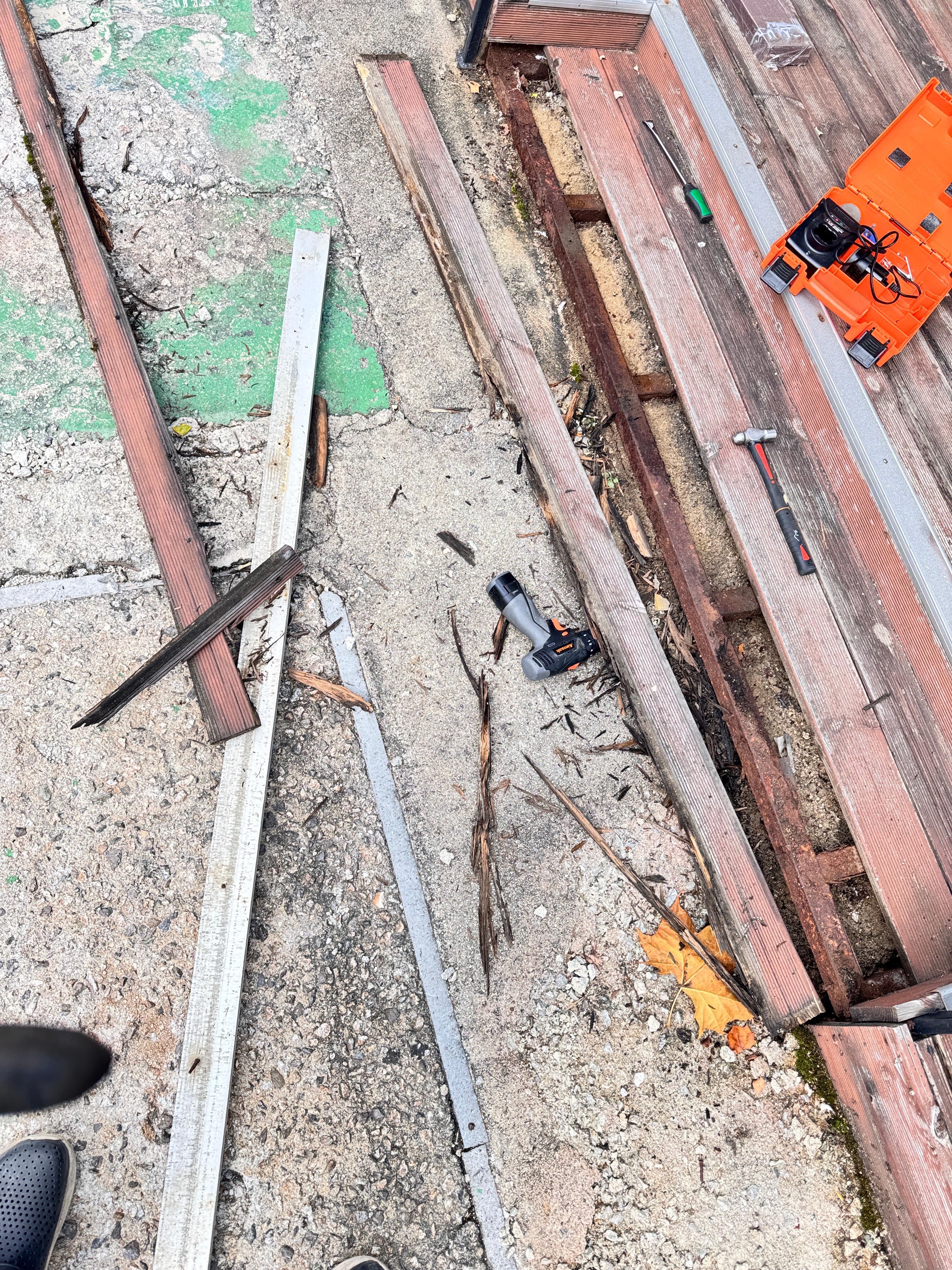 본격적인 작업은 기존 천연목 데크의 손상된 판재 제거부터 시작했습니다. 7년 동안 비와 햇빛을 그대로 맞은 데크는 생각보다 상태가 심각했습니다.