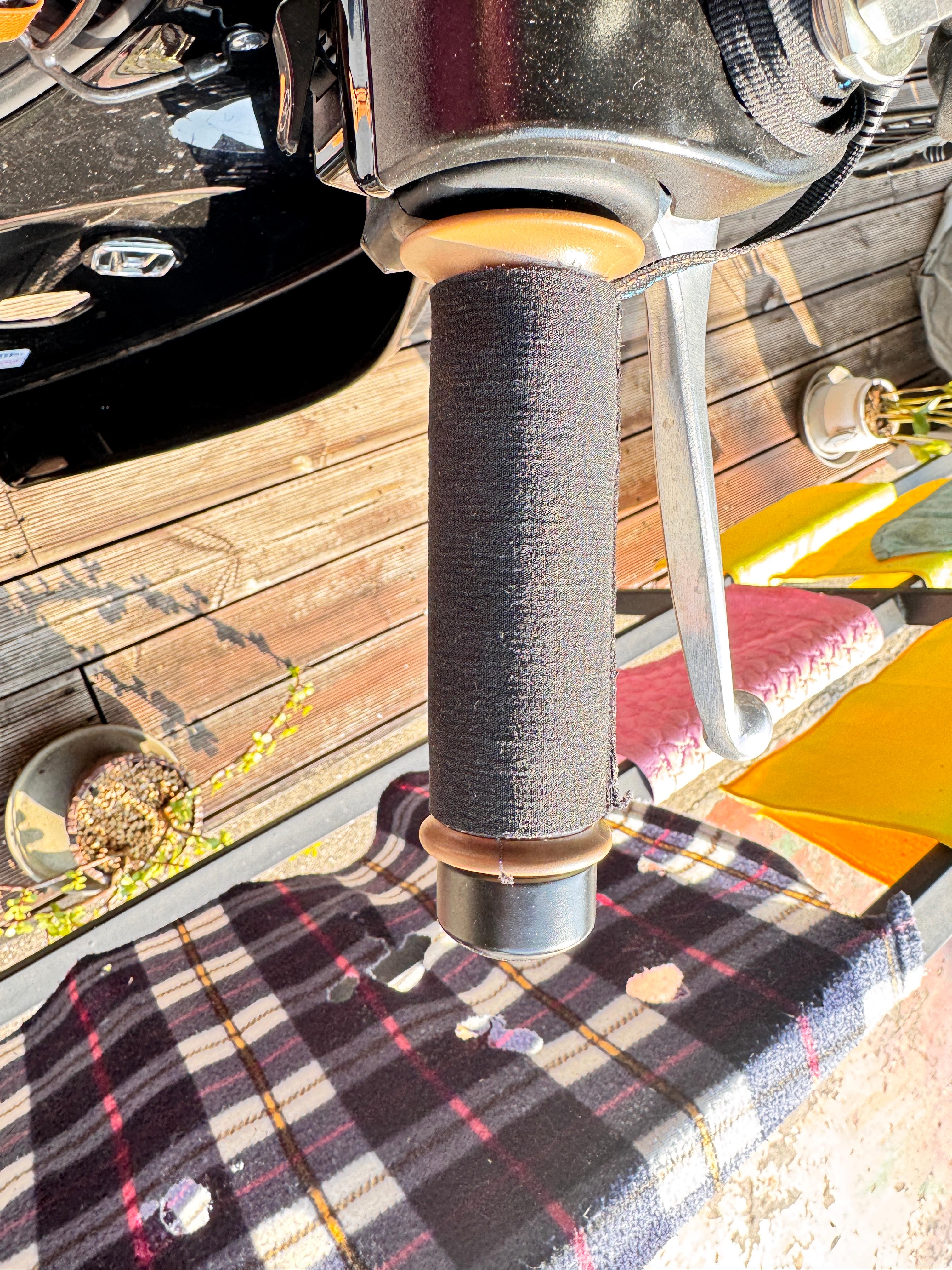 핸들 그립 위에 바로 감싸는 형태라 겨울 시즌만 사용하고 날이 풀리면 쉽게 분리가 가능합니다. 내부에는 얇은 열선 패드가 들어 있어 손바닥 전체로 열이 퍼지고 바깥쪽 커버는 열이 손실되지 않게 막아줘서 효율이 꽤 좋은 편입니다.