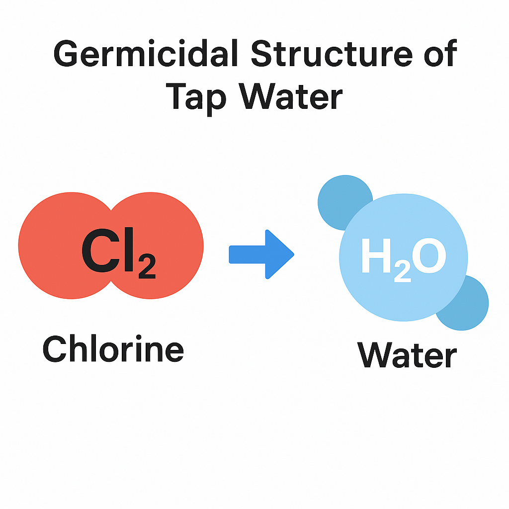 정수장에서 염소(Cl₂)는 물 속 세균을 산화시켜 제거하고, 우리 집 수도꼭지까지 오는 동안 2차 오염이 생기지 않도록 막아줍니다.