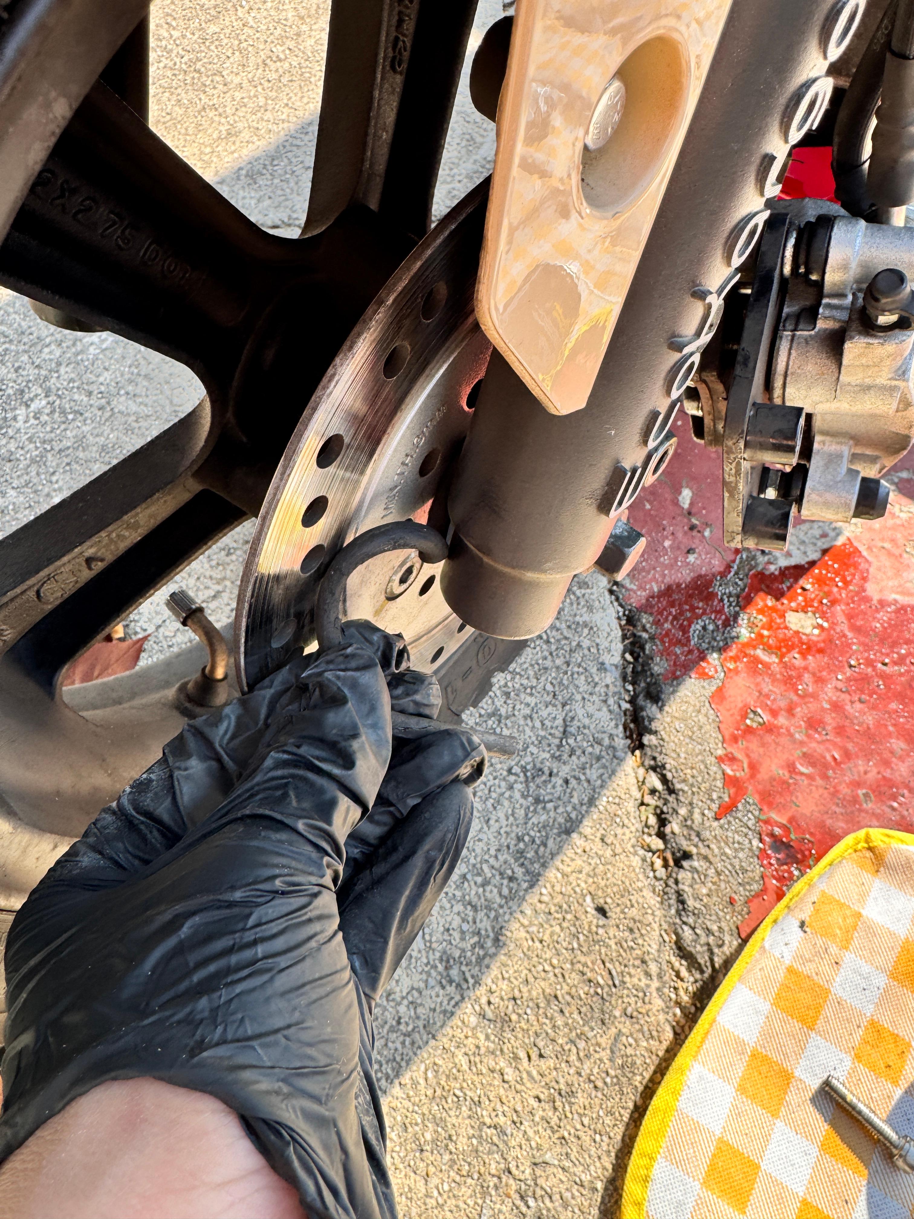 이상해서 그 검은 선을 조심스럽게 빼내보니, 오토바이에서 나온 케이블이 아니라 주행 중 바닥에 있던 얇은 선/끈 같은 이물질이 바퀴에 걸려 디스크 안쪽까지 말려 들어간 상태로 보였다.