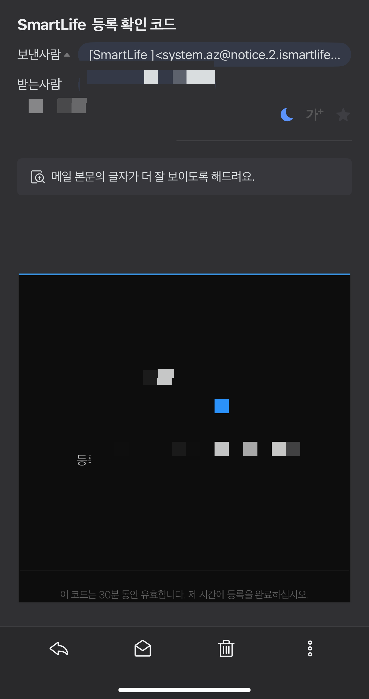 앱 설치는 앱스토어나 플레이스토어에서 ‘SmartLife’를 검색하면 바로 나온다. 설치 후 실행하면 국가 선택 → 개인정보 동의 화면이 순서대로 뜨고, 이어서 이메일 기반 회원가입을 하게 된다. 여기까지는 일반적인 절차인데, 이메일을 입력하면 바로 인증코드가 날아오기 때문에 받은 편지함을 열어 코드를 복사해서 붙여 넣으면 된다.