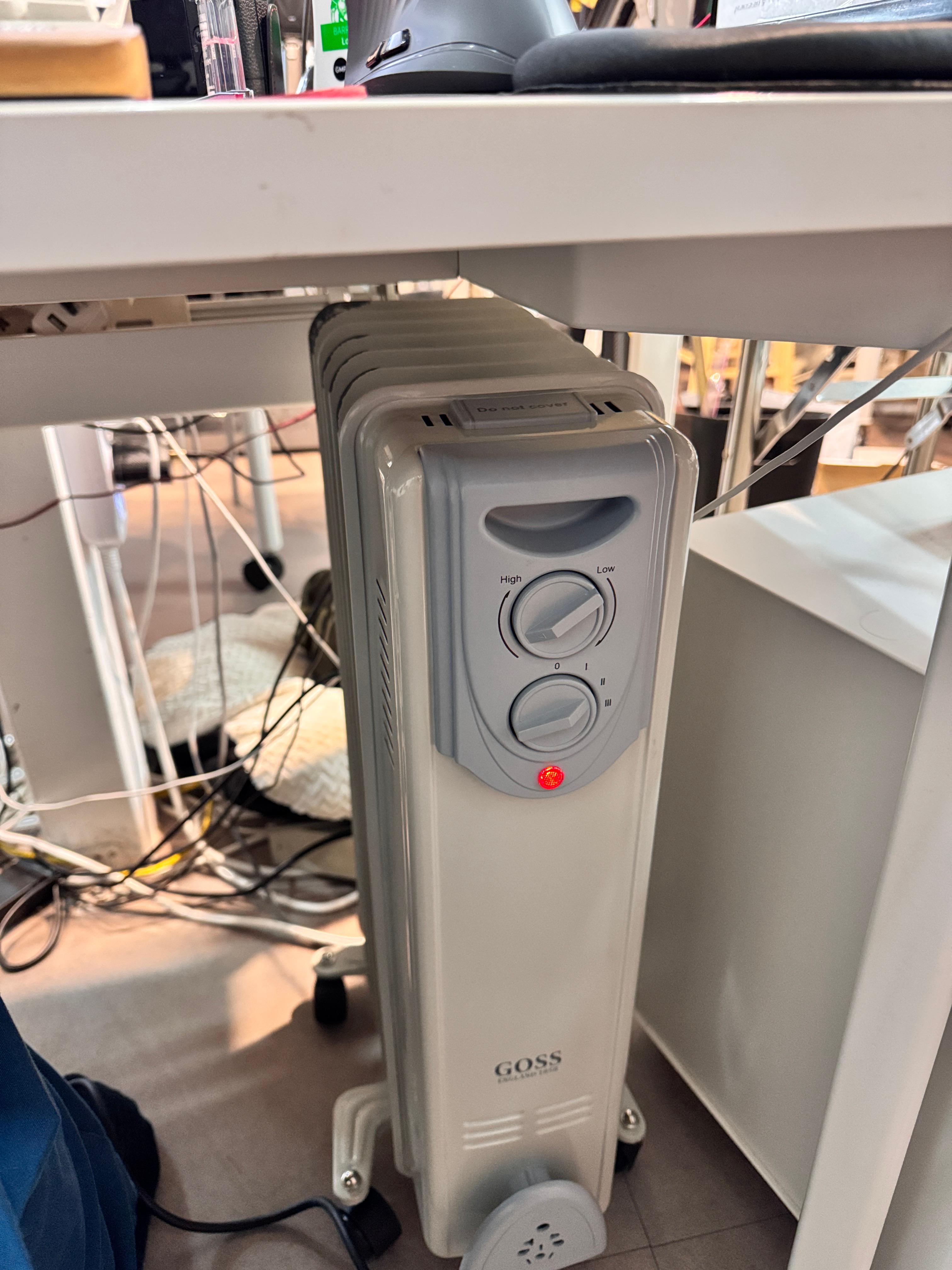 지금 사무실도 전체적으로는 꽤 추운 편인데, 책상 밑에 작은 오일 라디에이터를 두고 쓰니까 책상 아래쪽에서 올라오는 열이 내부에 머금어져서 스탠드형 냉난방기를 켜지 않아도 손발이 차갑지 않다.