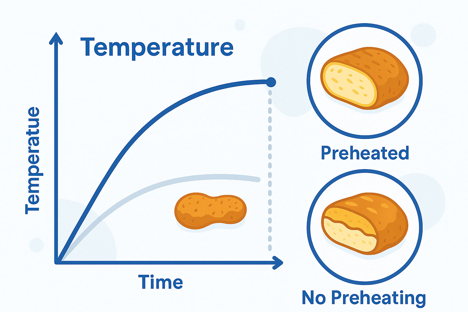 반대로 예열 없이 시작하면 기계가 온도를 끌어올리는 동안 음식 표면이 천천히 데워지는데, 이때 수분이 먼저 밖으로 빠져나가