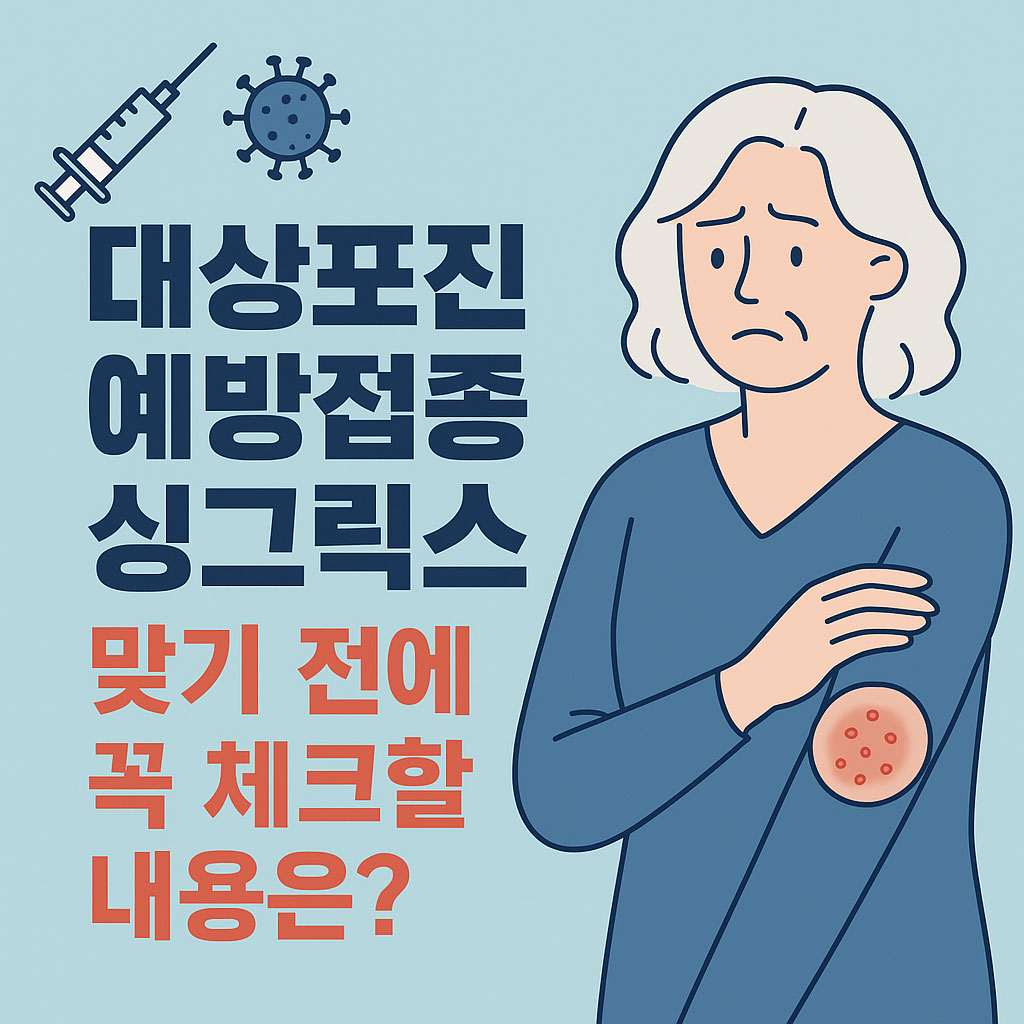 대상포진 예방접종 ‘싱그릭스’를 맞아볼까 고민하다 보면, 가격도 다 다르고 부작용 이야기도 많아서 헷갈리기 쉽다. 나도 이번에 접종을 앞두고 여러 정보를 찾아보면서, 미리 알고 가면 훨씬 마음이 편해지는 부분들이 있다는 걸 느꼈다. 그래서 오늘은 싱그릭스를 맞기 전에 꼭 체크해야 하는 핵심 포인트를 정리해본다. 나는 내일 접종을 하기 때문에 내일 접종을 앞둔 사람 입장에서 실제로 도움이 될 만한 내용들을 정리해봤다.