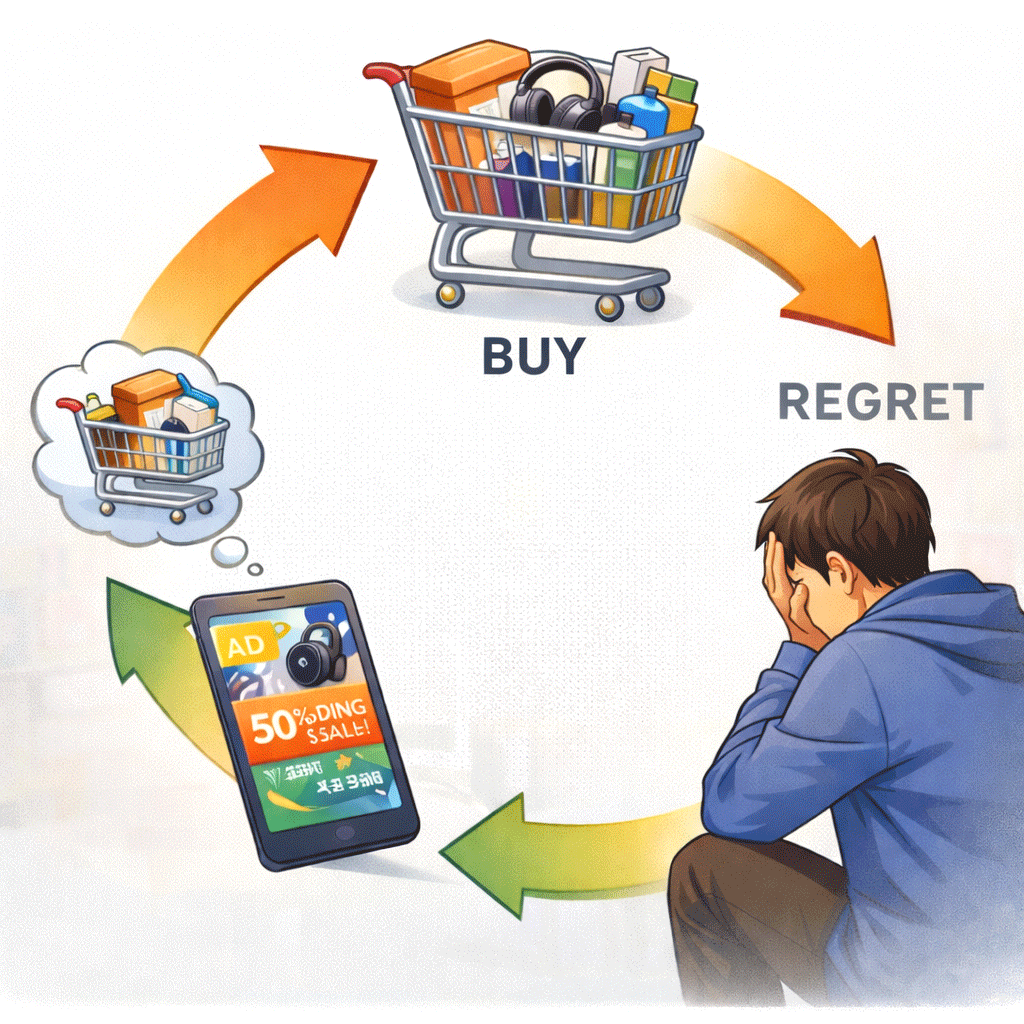 하지만 문제는 의지가 아닙니다. 구조가 그대로 남아 있기 때문입니다. 광고는 다시 노출되고, 세일은 또 시작됩니다. 환경이 바뀌지 않으면 선택은 반복됩니다. 설득된 상태 → 빠른 결정 → 잠깐의 만족 → 가벼운 후회라는 이 익숙한 사이클은 우리가 그 구조 속에 있는 한 계속됩니다.