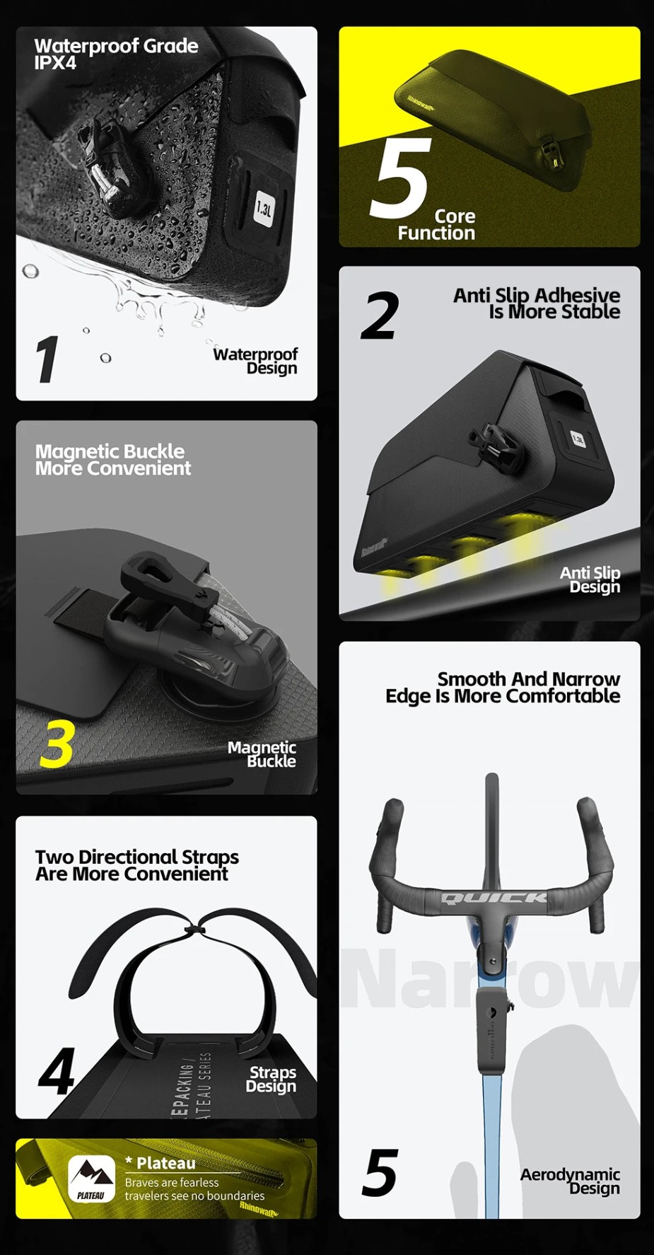다음은 무릎 간섭을 고려한 외형 설계입니다. 탑튜브 가방은 위치 특성상 허벅지와 가까울 수밖에 없는데, 이 제품은 측면이 불필요하게 벌어지지 않는 하드쉘 형태로 설계되어 페달링 시 다리와의 접촉 가능성을 최소화했습니다. ‘Not Hit The Leg’라는 표현이 강조되는 이유도 이 지점에 있습니다.