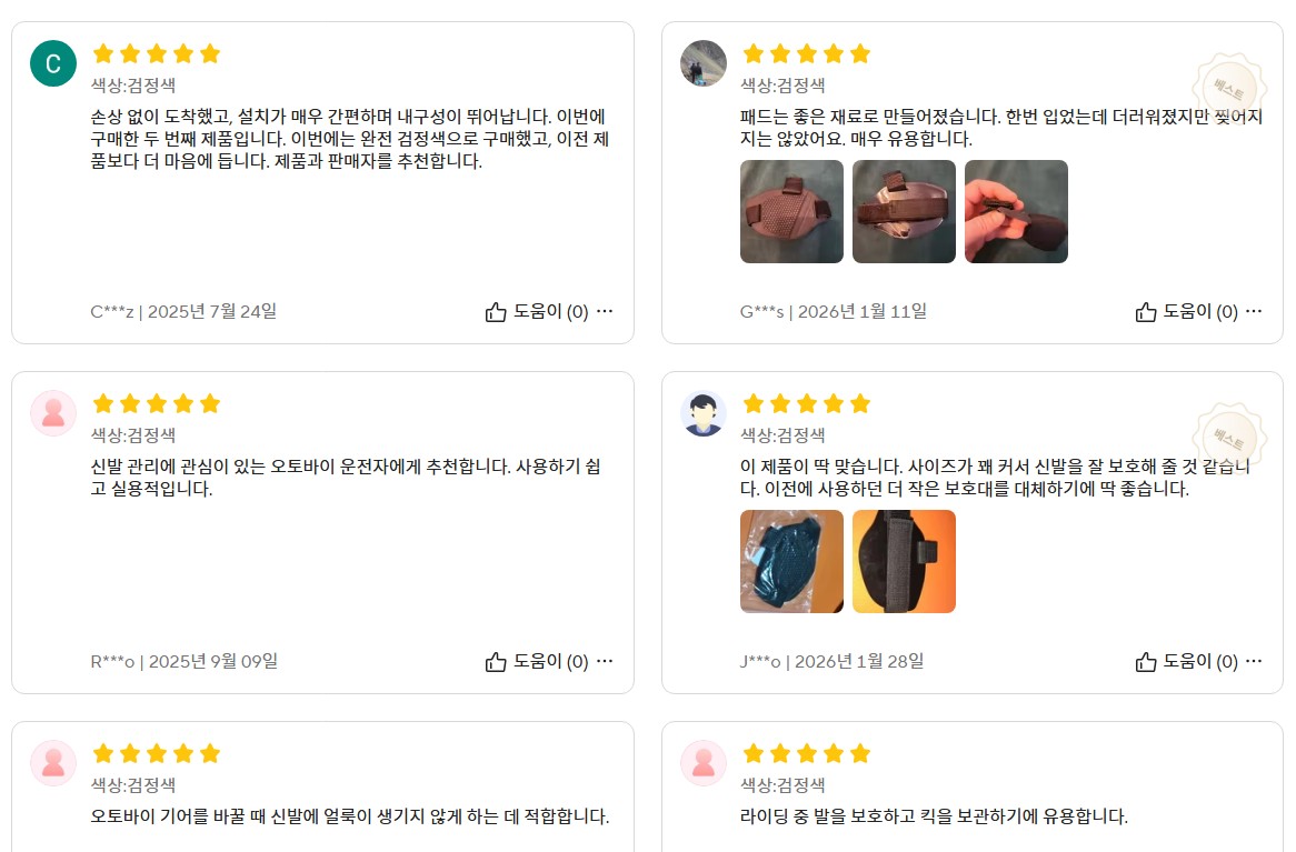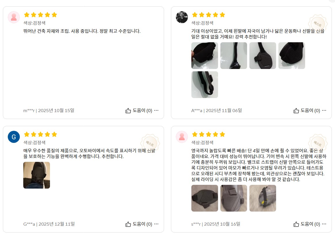 이건 라이딩 부츠를 대체하는 장비가 아니다. 완전한 보호를 기대하면 안 된다. 강하게 스포츠 주행을 하거나, 오프로드처럼 격한 환경에서는 한계가 있다. 그리고 디자인은 솔직히 감수해야 한다. 깔끔한 스니커즈 위에 고무 패드가 올라가면 미관은 포기해야 한다.