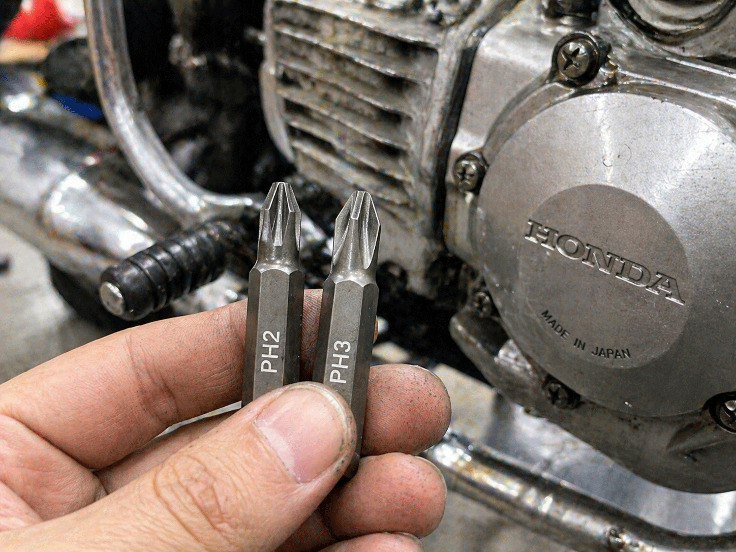 슈퍼커브는 일반 십자(Phillips)가 아니라 JIS(일본 공업 규격) 볼트를 사용합니다. 차이가 생각보다 큽니다. 일반 십자 비트도 볼트에 들어가긴 합니다. 하지만 결합 방식이 다르기 때문에 토크를 가할 때 미끄러질 가능성이 훨씬 높아집니다.