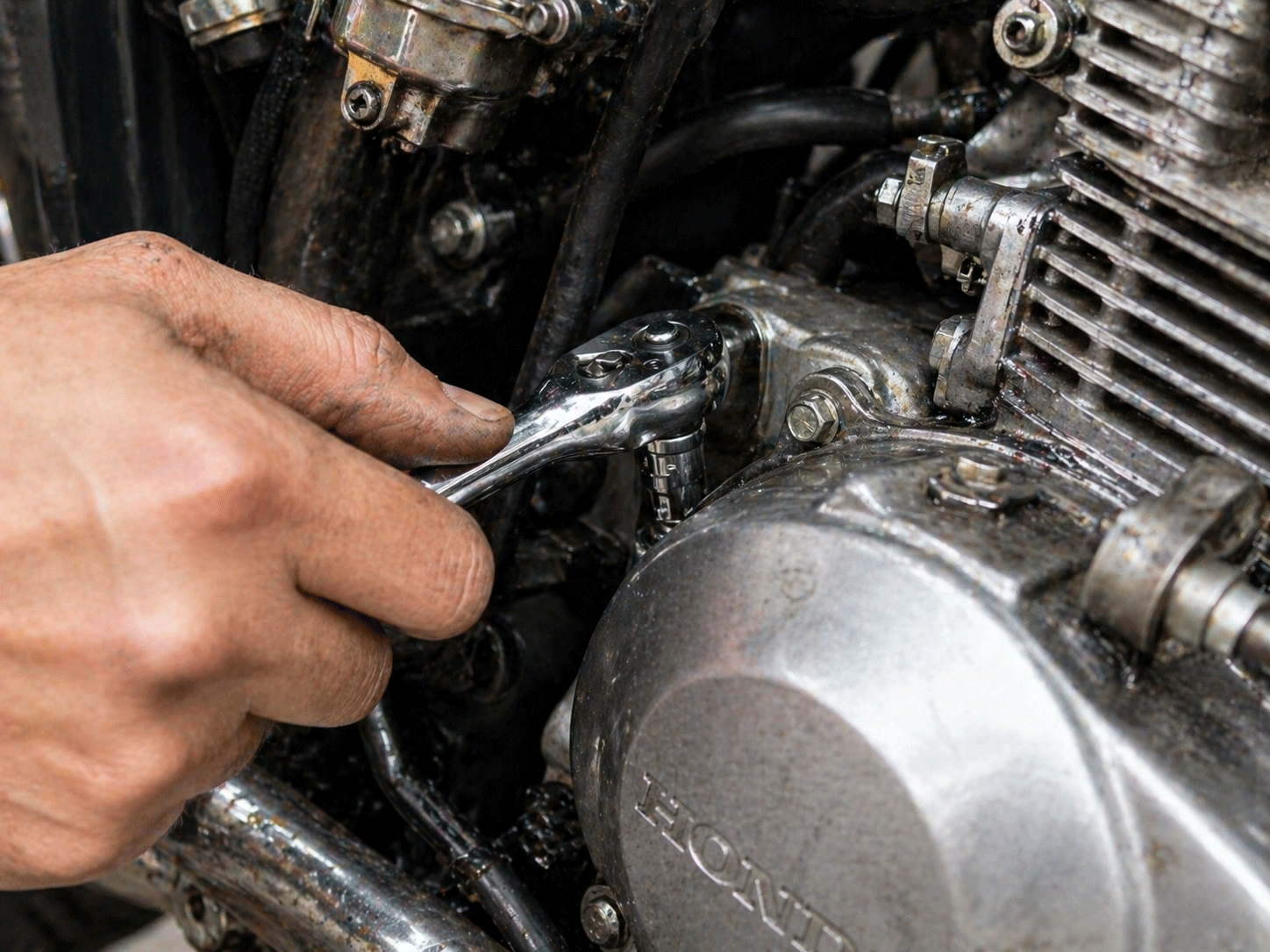 오픈 스패너도 작동은 합니다. 하지만 슈퍼커브는 볼트 주변 공간이 좁은 경우가 많아서, 라쳇과 소켓 조합으로 작업하면 훨씬 수월합니다. 일정한 토크를 유지하면서 좁은 공간에서 작업하고, 매번 공구를 재배치하지 않아도 되기 때문입니다.