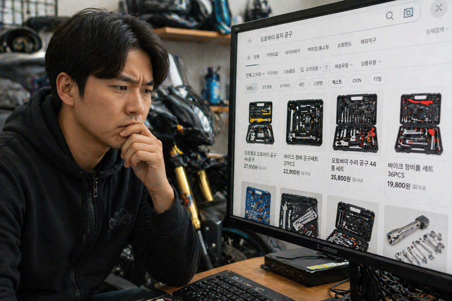 오토바이 공구 추천을 검색하면 수십 가지 규격, 특수 공구, 브랜드 추천이 쏟아집니다. 포럼마다 정보가 다르고, 제품 페이지마다 스펙이 제각각입니다. 대부분의 공구 세트는 모든 오토바이를 커버하도록 설계되어 있기 때문에 슈퍼커브에서는 평생 쓸 일 없는 규격이 절반 이상 포함되어 있습니다.