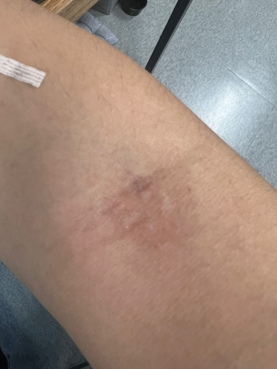 살성이 다른 부분과 달리 비후성 반흔의 징후가 관찰되는 중이다.