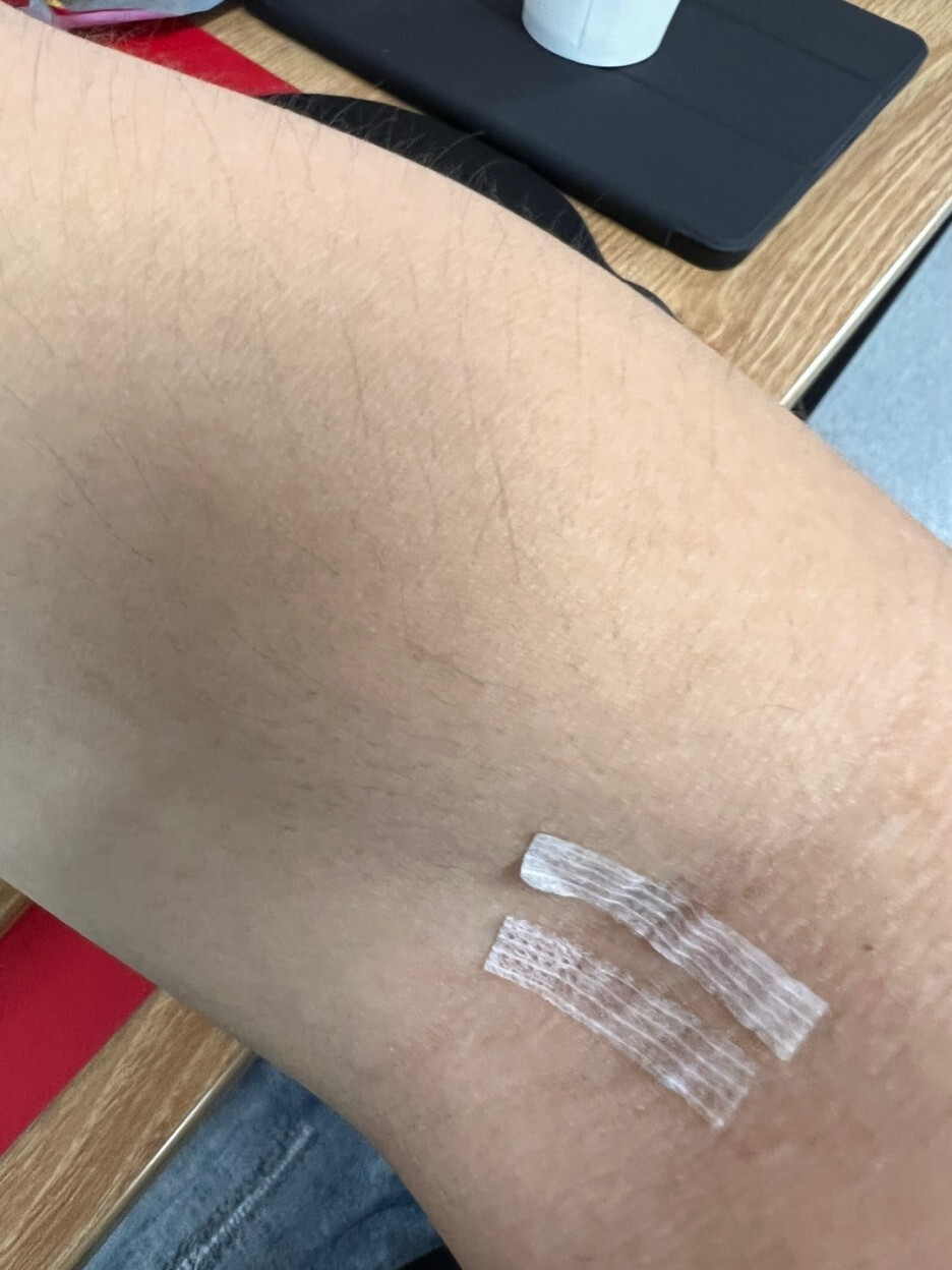 비후성반흔의 징후가 있어 시카케어 실리콘 겔을 붙인 후 위에 스트립으로 고정했다.