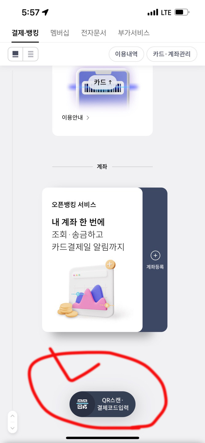 앱에 접속해서 카드. 계좌관리 탭에서 하단의 카드.계좌 등록 하기 버튼을 클릭하면