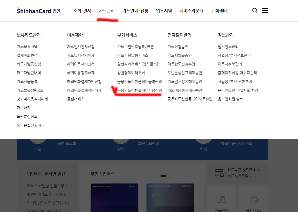 카드 관리- 부가서비스- 공용카드신한 플레이사용신청 탭으로 들어간다.