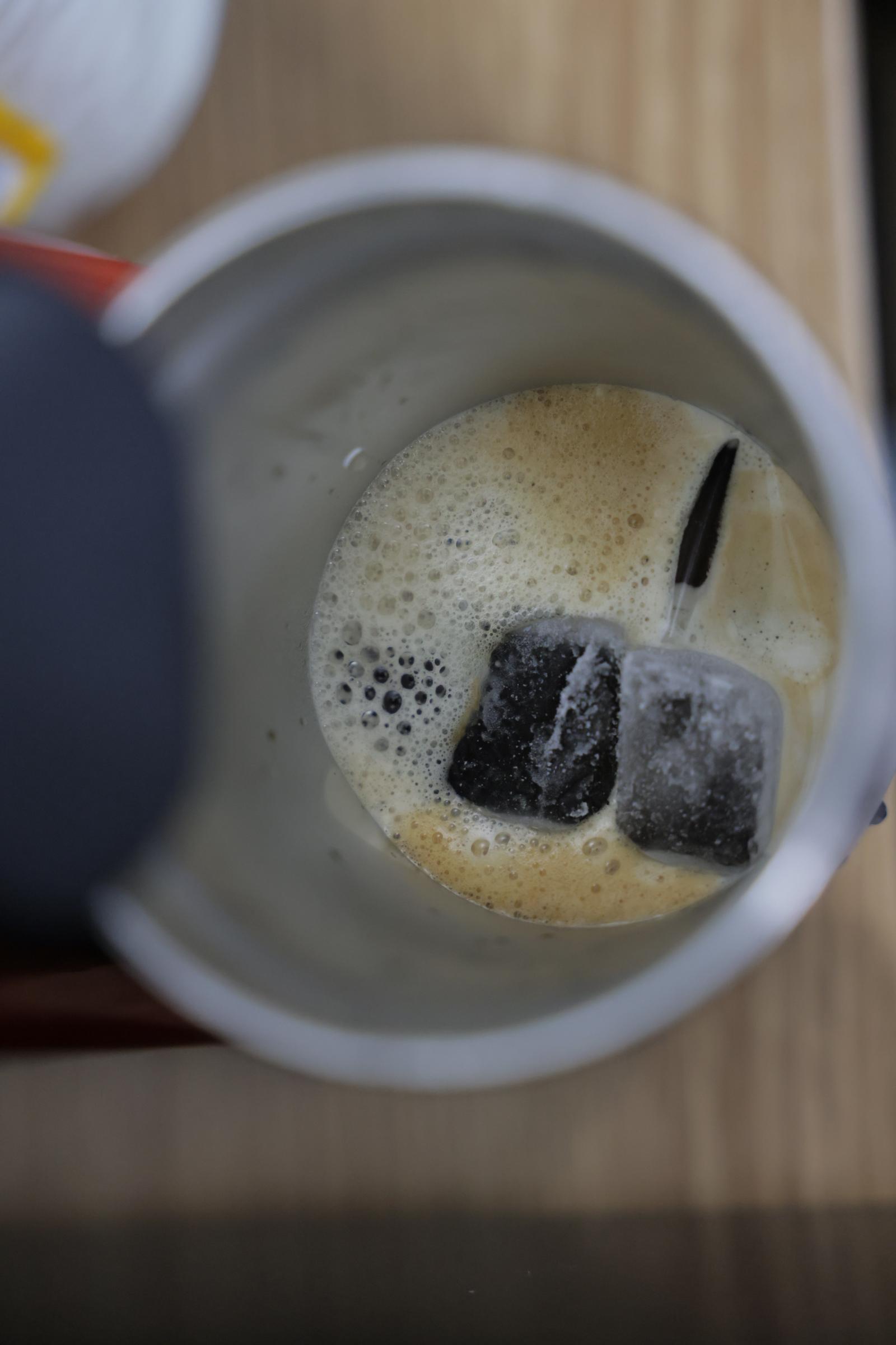 뜨거운 커피가 차가운 얼음과 텀블러 안에서 교감하고 있다.
