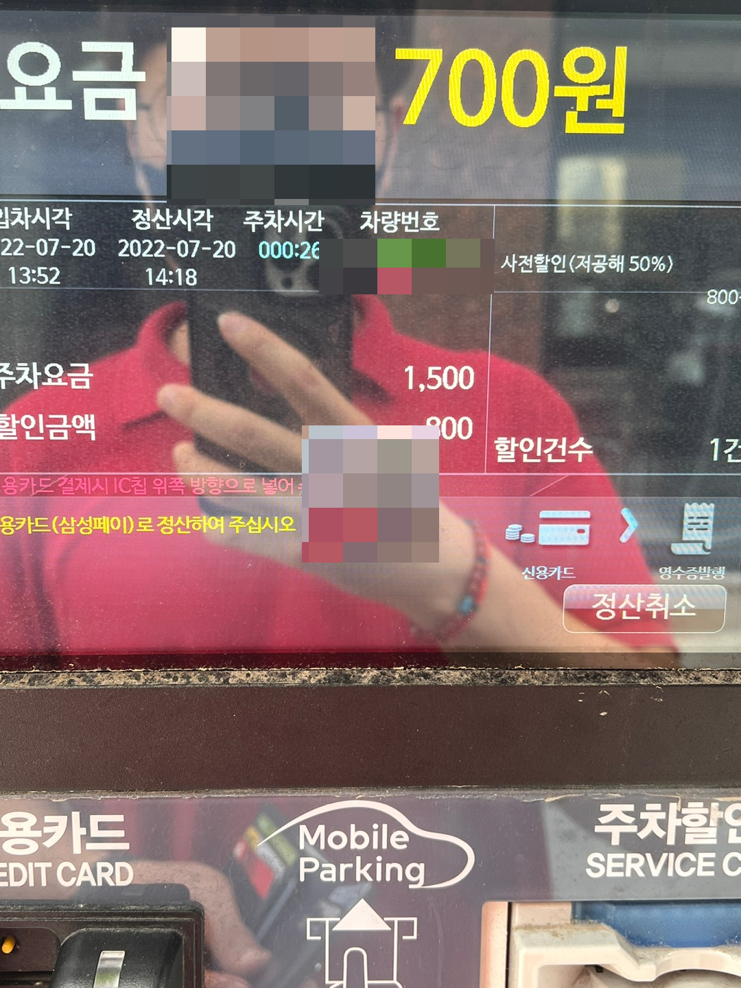 약 26분간 주차를 하고 800원(전기차 자동 할인)을 할인받아 700원을 결제하였다.