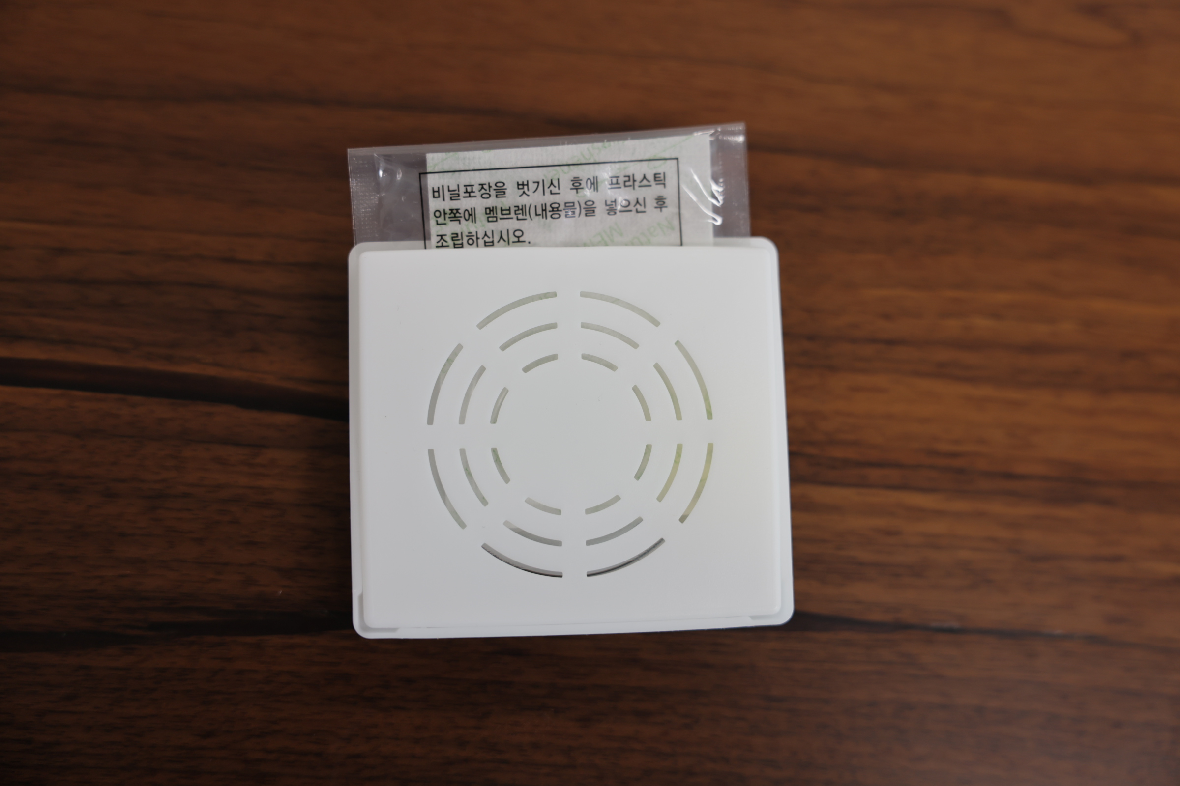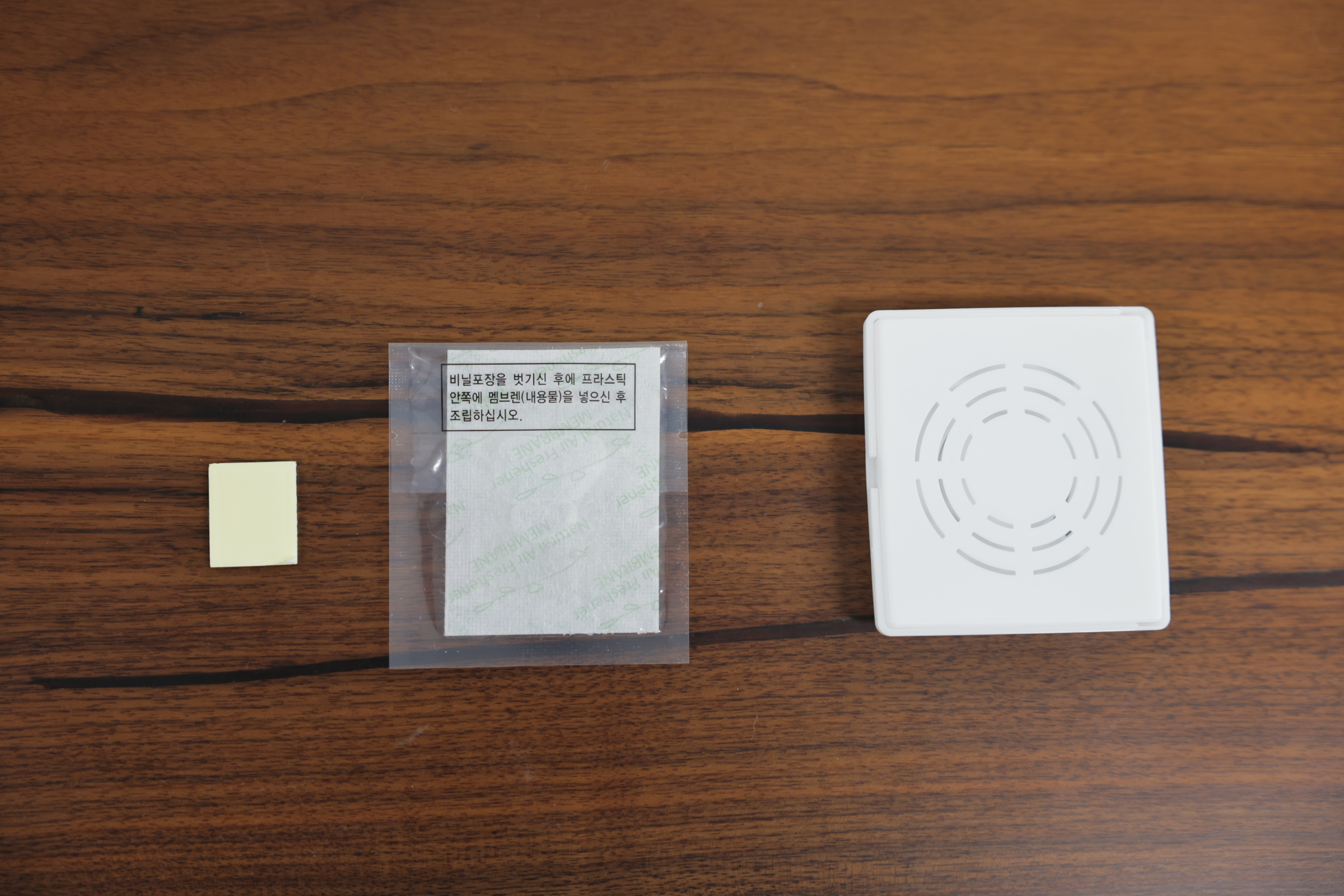 3. 내용물(멤브렌)을 넣고 케이스를 닫은 후 케이스 뒷 면에 양면테이프를 붙여준다.