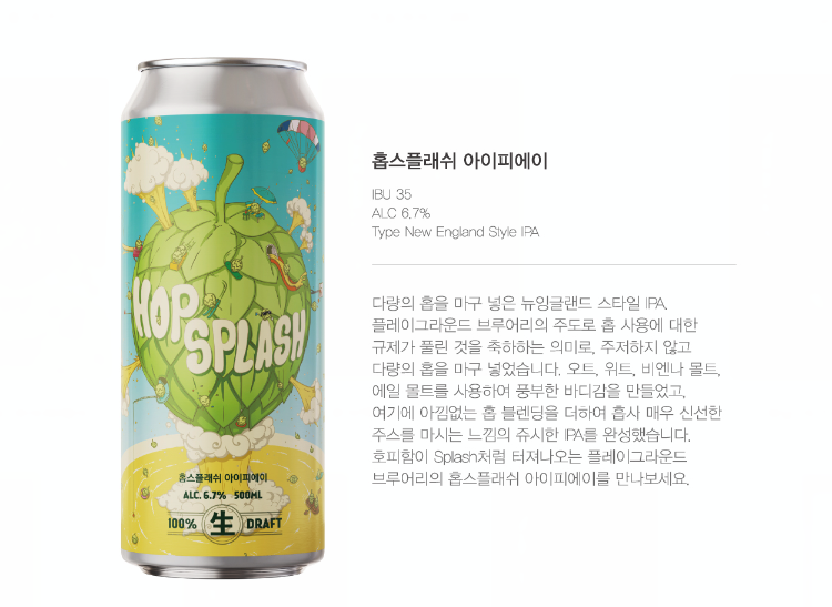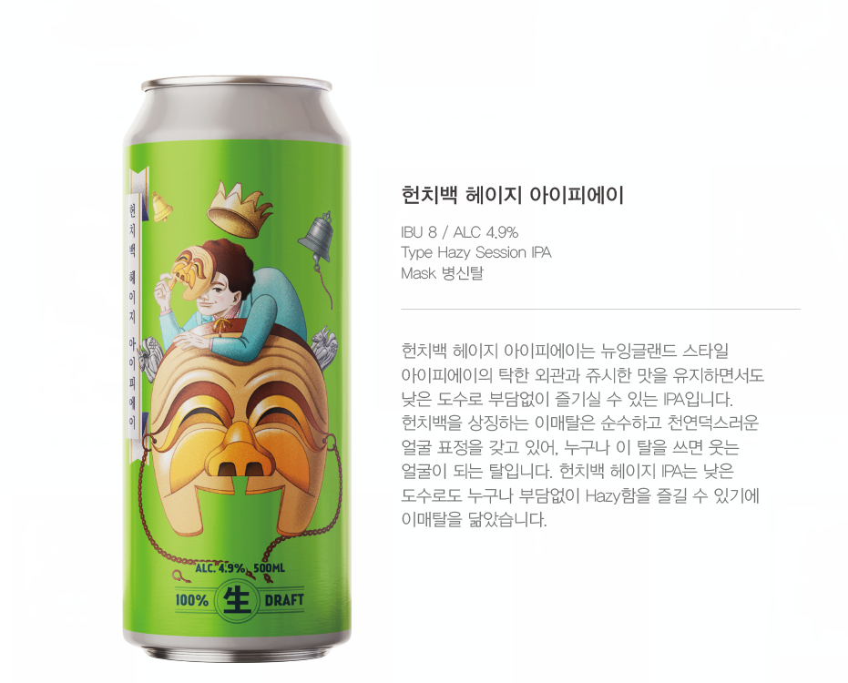 뉴잉글랜드 스타일 아이피에이의 탁한 외관과 쥬시한 맛을 유지하면서 낮은 도수인 것이 특징
