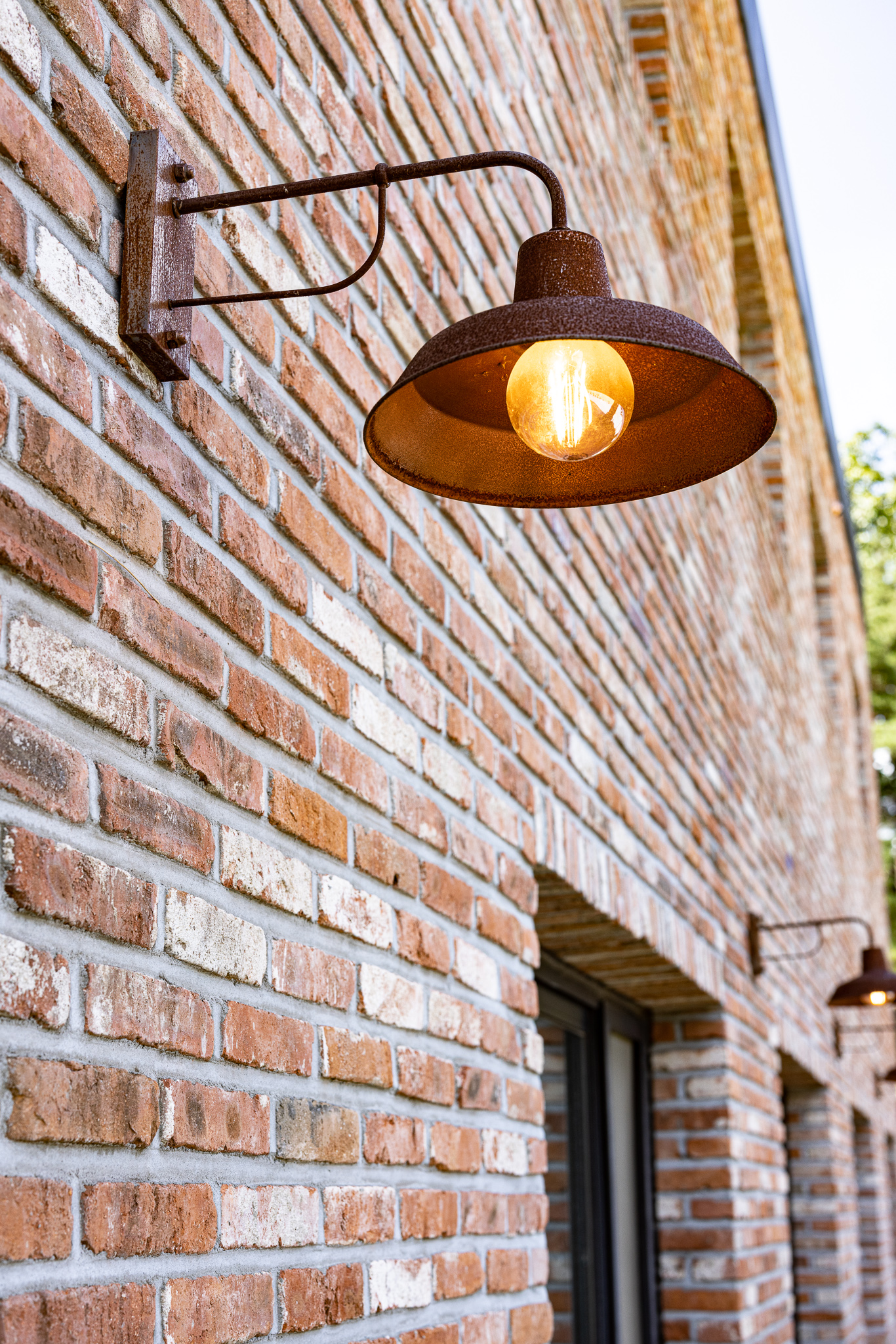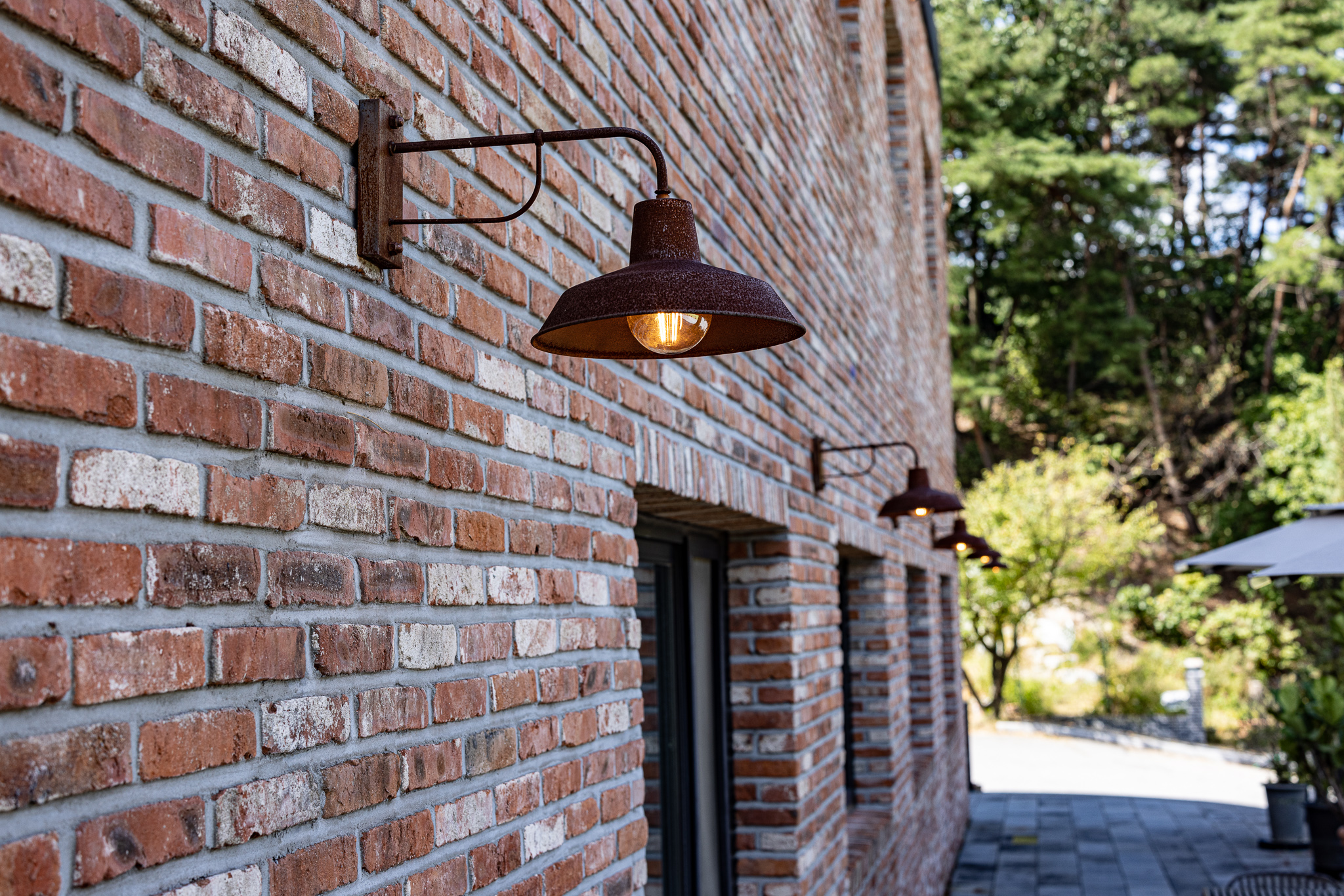 적벽돌로 이루어진 건물 외벽에 일정한 간격으로 벽부등이 부착되어 있다.