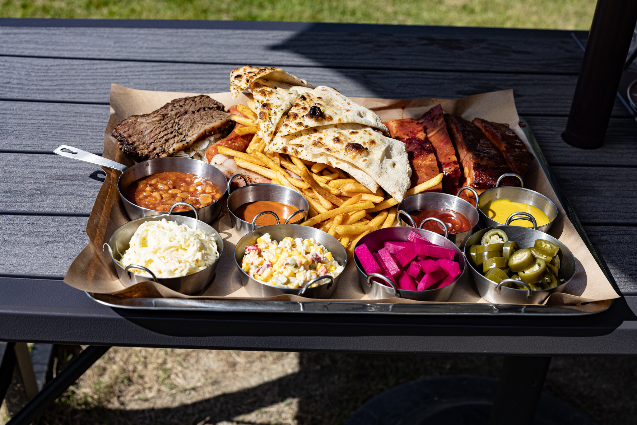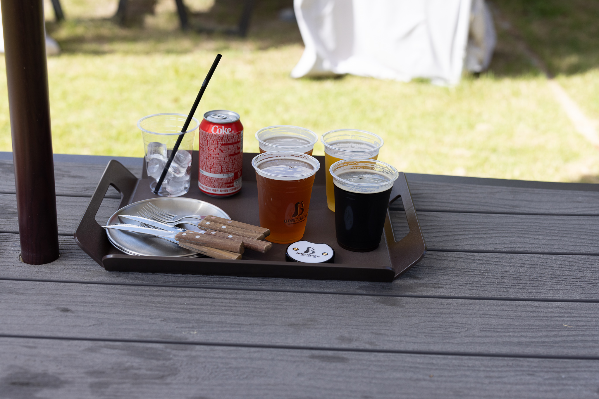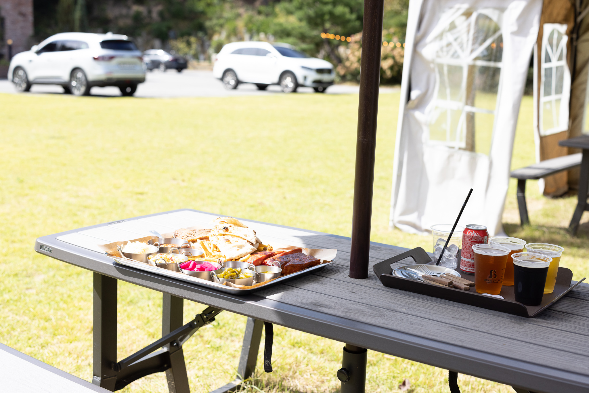 볓은 아직 뜨거웠지만 야외 테이블에서 먹기로 했다.