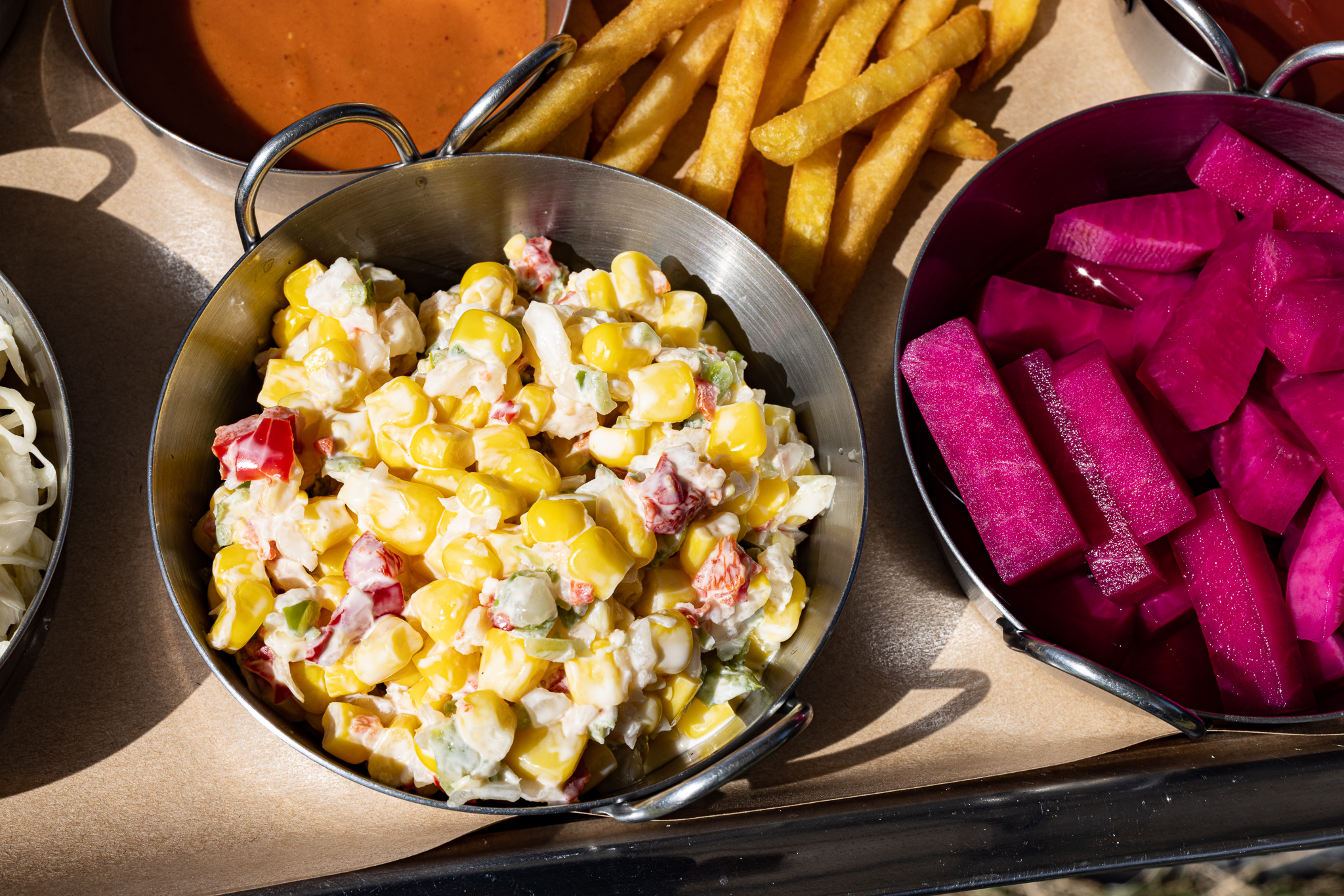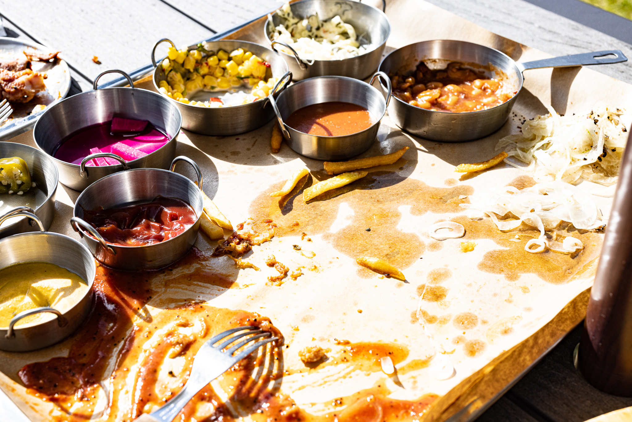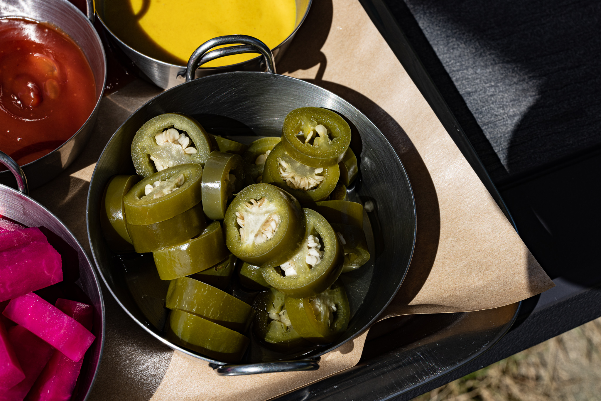 볓은 아직 뜨거웠지만 야외 테이블에서 먹기로 했다.
