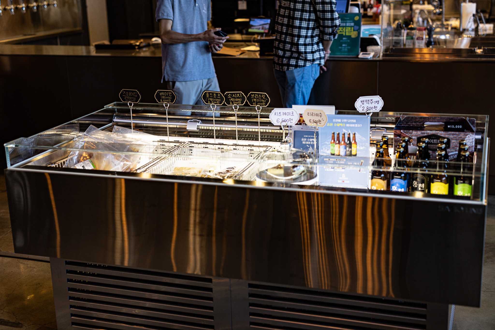 매장 한편에 있는 냉장 바에 홍천 맥주병 세트가 있고