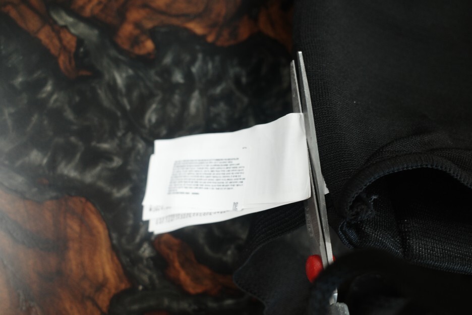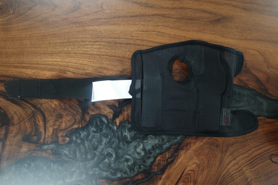 왼쪽 보호대에는 아주 거추장스럽게 하얀색의 택이 달려있다.