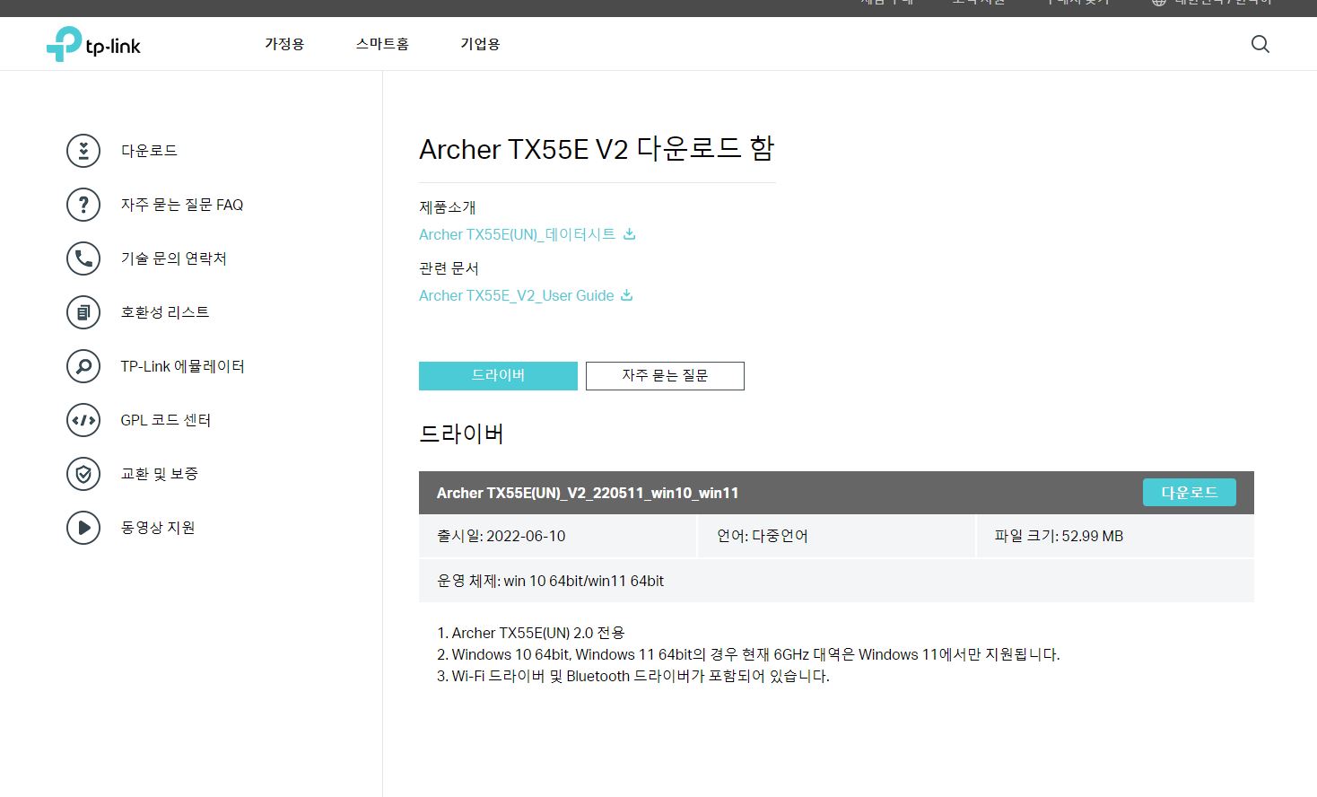 티피링크 홈페이지에 접속하여 내 랜카드를 검색 후